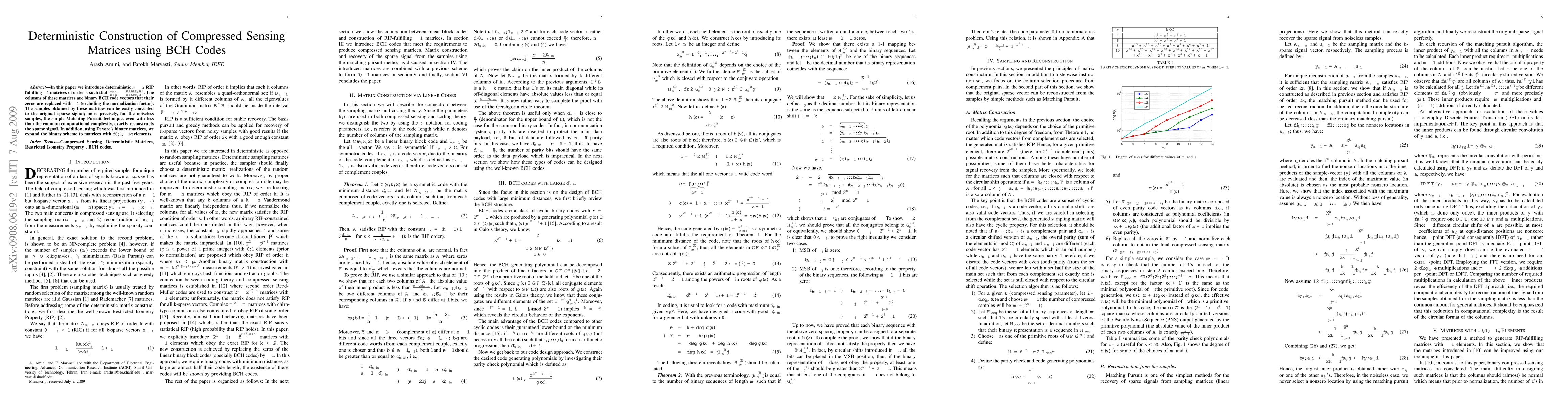 This paper introduces a method to construct compressed sensing matrices using BCH codes, allowing for efficient reconstruction of sparse signals with reduced computational complexity.