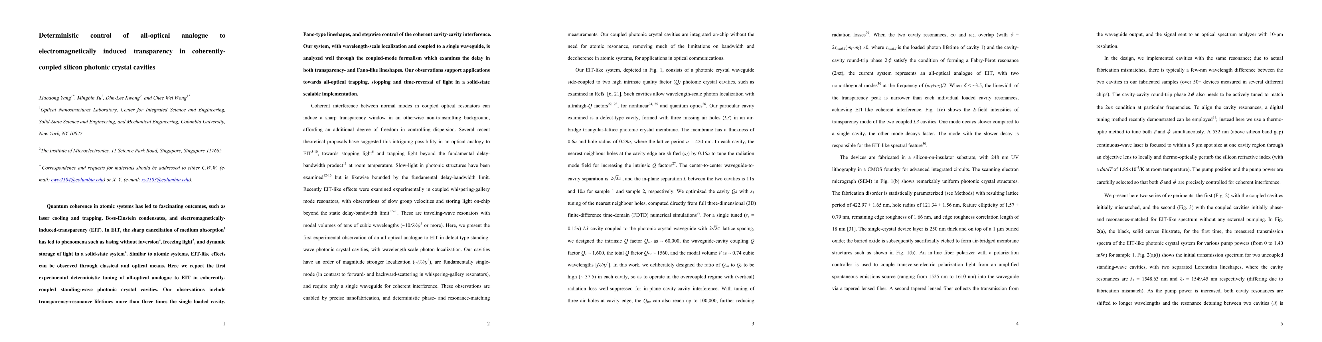 This paper reports the first deterministic control of an all-optical analogue to electromagnetically induced transparency (EIT) in silicon photonic crystal cavities, demonstrating enhanced transparency-resonance lifetimes and Fano-type lineshapes, with potential applications in all-optical trapping and time-reversal of light.
