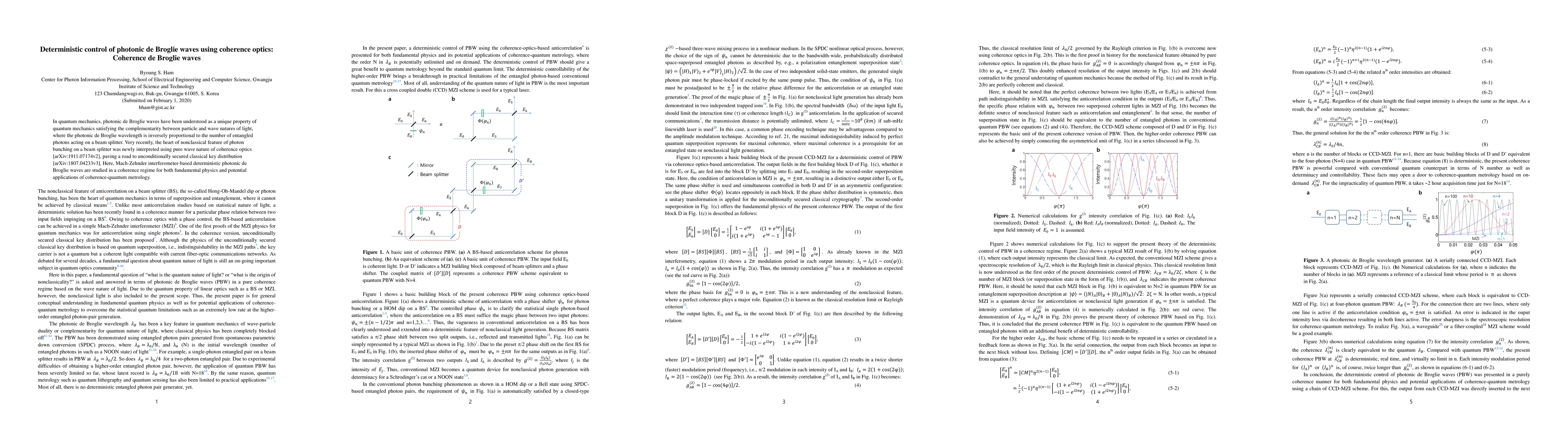This paper explores the deterministic control of photonic de Broglie waves using coherence optics, demonstrating how the wave nature of light can be manipulated to achieve secure classical key distribution and applications in coherence-quantum metrology. The study utilizes a Mach-Zehnder interferometer to investigate these photonic de Broglie waves in a coherence regime.