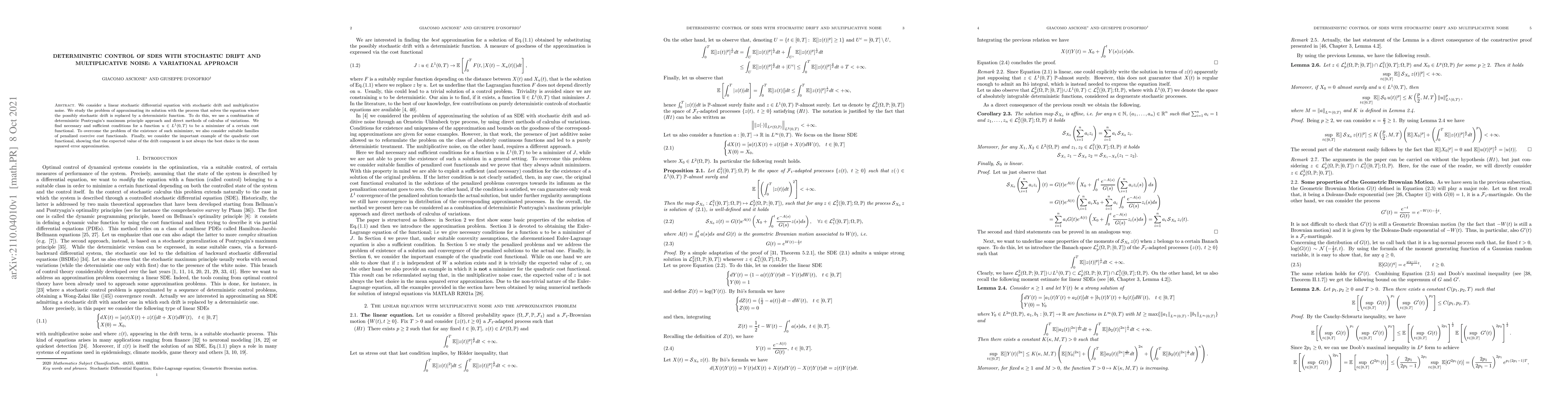 We consider a linear stochastic differential equation with stochastic drift and multiplicative noise. We study the problem of approximating its solution with the process that solves the equation where the possibly stochastic drift is replaced by a deterministic function. To do this, we use a combination of deterministic Pontryagin's maximum principle approach and direct methods of calculus of variations. We find necessary and sufficient conditions for a function $u \in L^1(0,T)$ to be a minimizer of a certain cost functional. To overcome the problem of the existence of such minimizer, we also consider suitable families of penalized coercive cost functionals. Finally, we consider the important example of the quadratic cost functional, showing that the expected value of the drift component is not always the best choice in the mean squared error approximation.