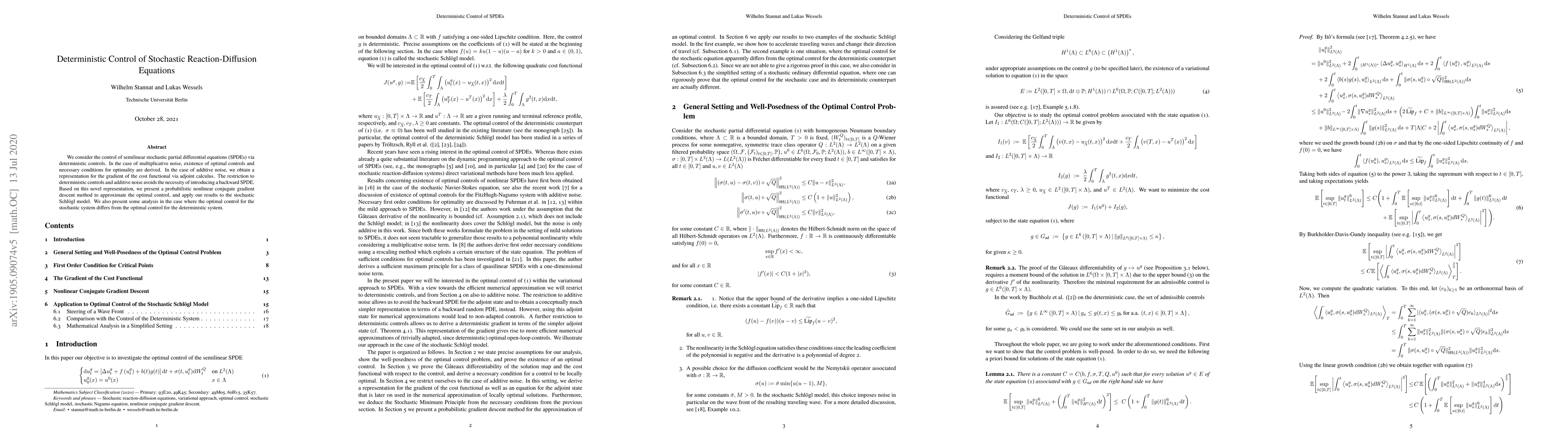 This paper develops deterministic control methods for semilinear stochastic partial differential equations (SPDEs) under multiplicative and additive noise. It presents a probabilistic nonlinear conjugate gradient descent method for approximating optimal controls and applies these techniques to the stochastic Schlögl model, while analyzing differences between optimal controls in stochastic and deterministic systems.