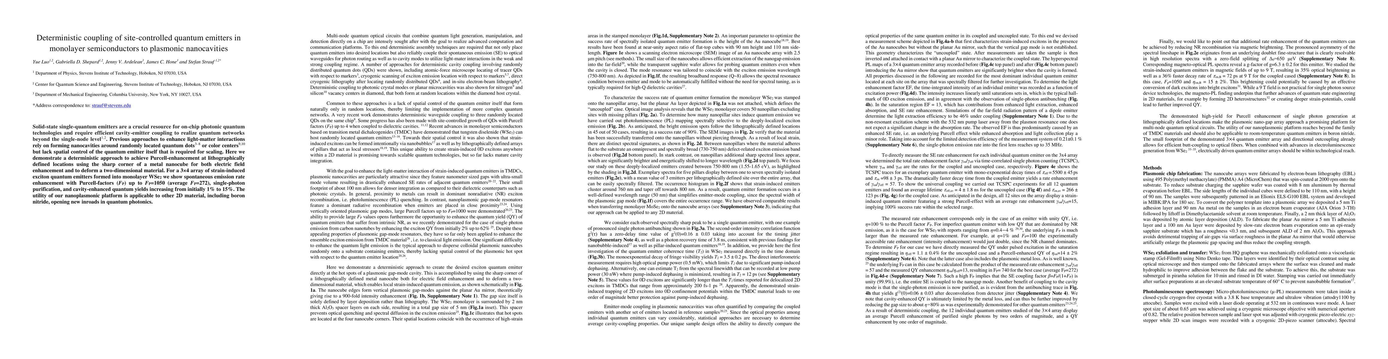 This paper demonstrates a deterministic method to couple site-controlled quantum emitters in monolayer WSe2 to plasmonic nanocavities, achieving Purcell-enhancement factors up to 1050 and improving quantum yields from 1% to 15%, paving the way for scalable quantum photonic technologies.