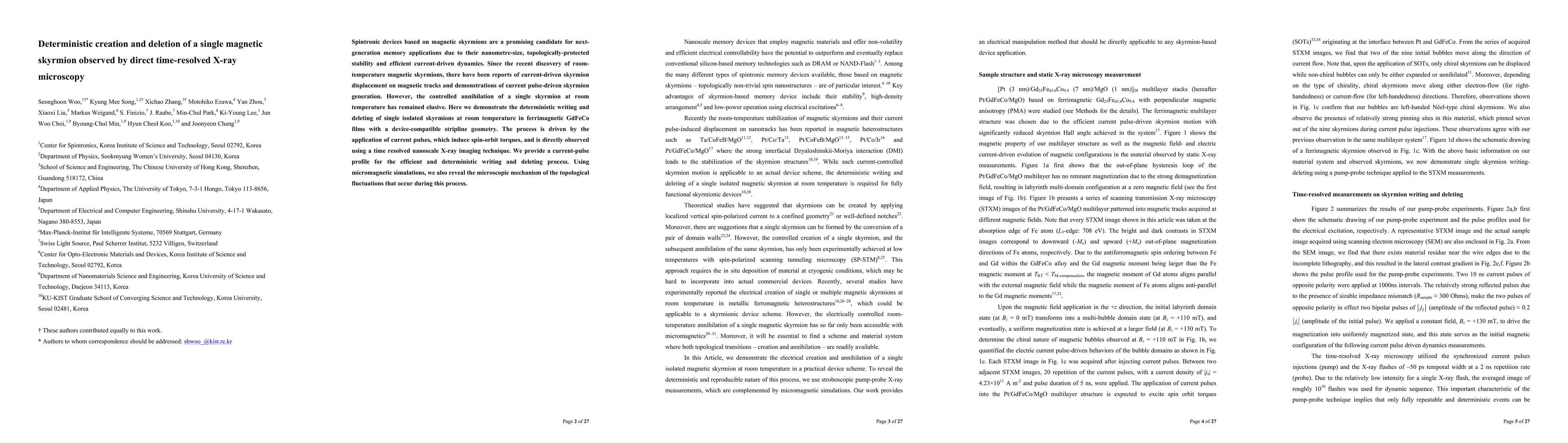 This paper demonstrates the controlled creation and deletion of a single magnetic skyrmion at room temperature using current pulses in ferrimagnetic GdFeCo films, observed via time-resolved X-ray microscopy. The study provides a current-pulse profile for efficient skyrmion manipulation and uses micromagnetic simulations to elucidate the underlying microscopic mechanisms.