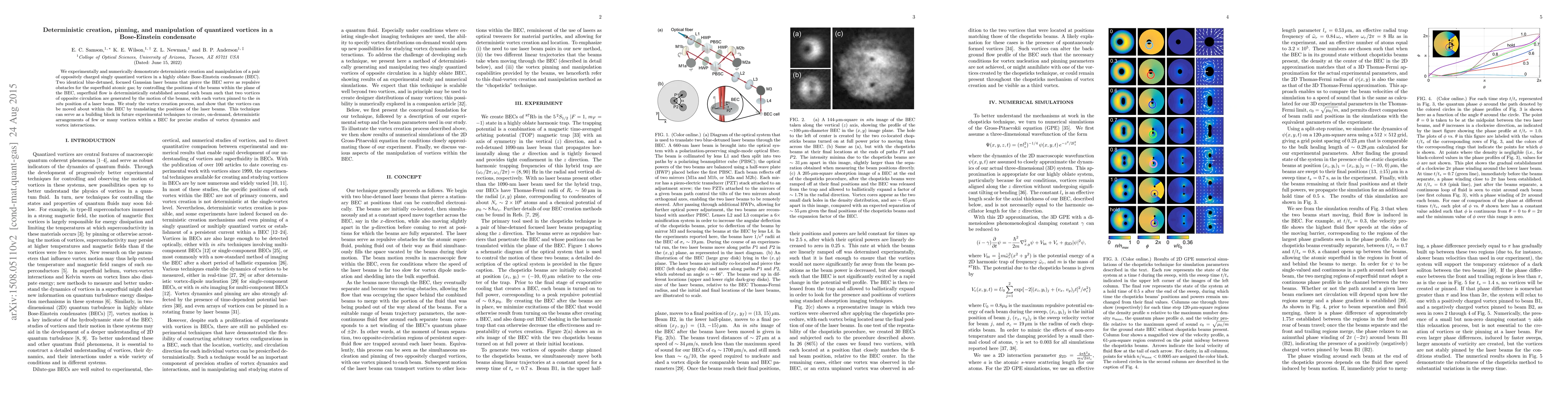 This paper demonstrates the deterministic creation and manipulation of quantized vortices in a Bose-Einstein condensate using focused laser beams, which act as repulsive obstacles to establish superfluid flow, generating and pinning vortices at specific locations. The technique allows for precise control over vortex positions, paving the way for detailed studies of vortex dynamics and interactions.