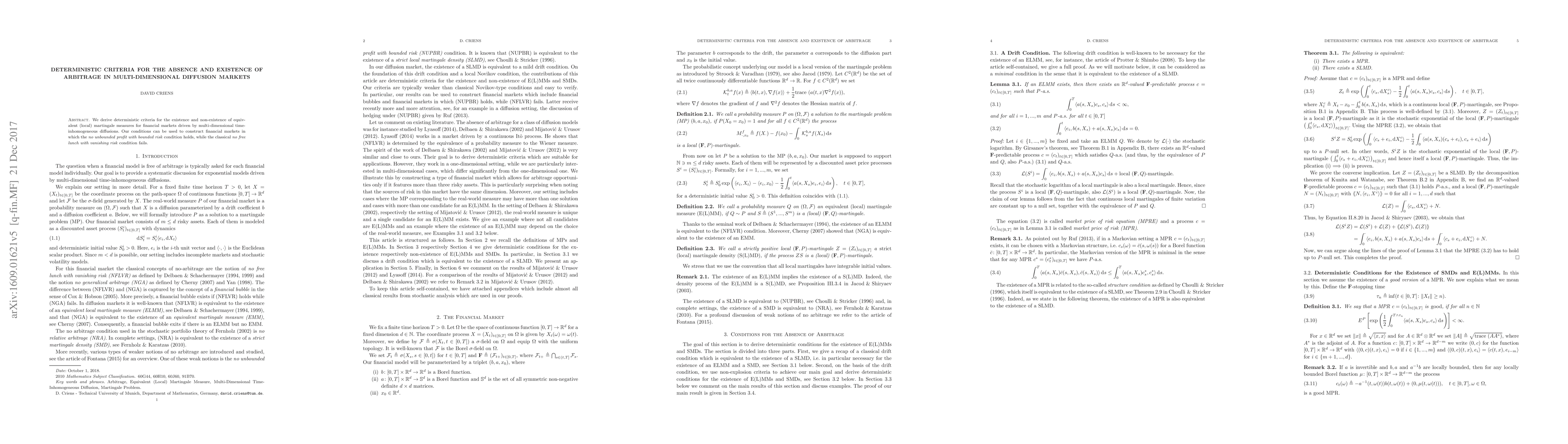 Researchers derive deterministic criteria for existence and non-existence of equivalent martingale measures in multi-dimensional diffusion markets, enabling the construction of risk-free markets with no unbounded profit.