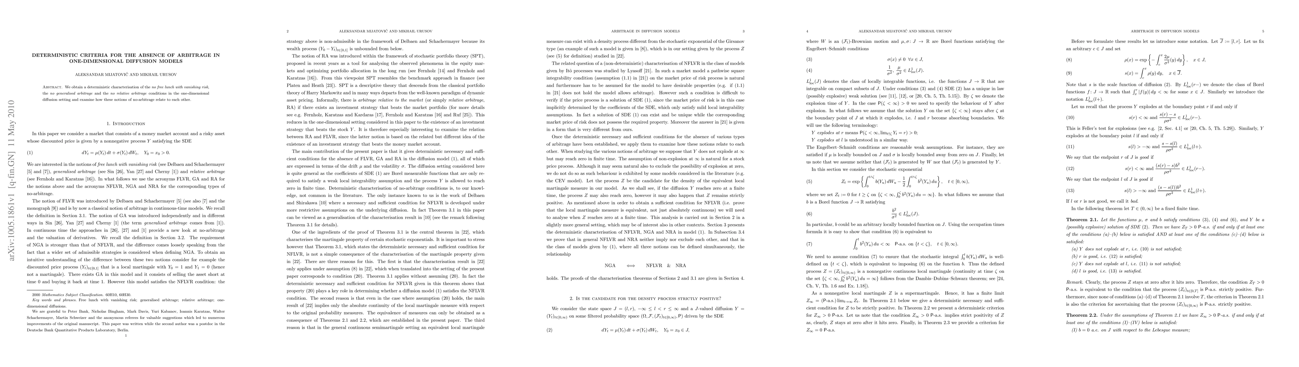 We obtain a deterministic characterisation of the \emph{no free lunch with vanishing risk}, the \emph{no generalised arbitrage} and the \emph{no relative arbitrage} conditions in the one-dimensional diffusion setting and examine how these notions of no-arbitrage relate to each other.