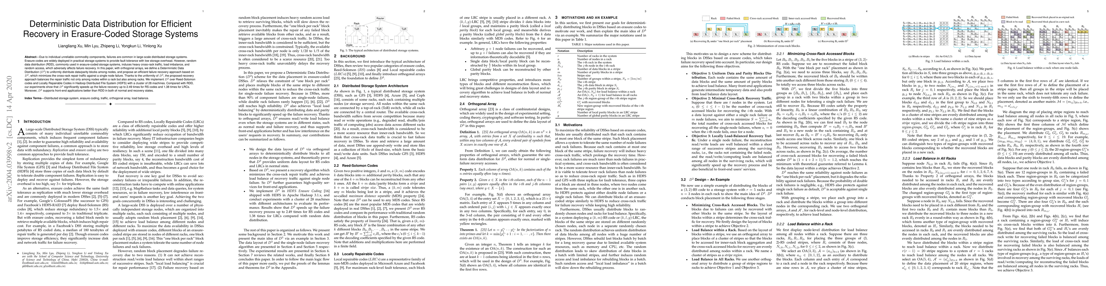 This paper proposes a Deterministic Data Distribution ($D^3$) method using orthogonal arrays to uniformly distribute data/parity blocks in erasure-coded storage systems, significantly reducing cross-rack traffic and improving failure recovery efficiency. Experiments show $D^3$ speeds up recovery by up to 2.49 times for Reed-Solomon codes and 1.38 times for Locally Repairable Codes compared to random data distribution.
