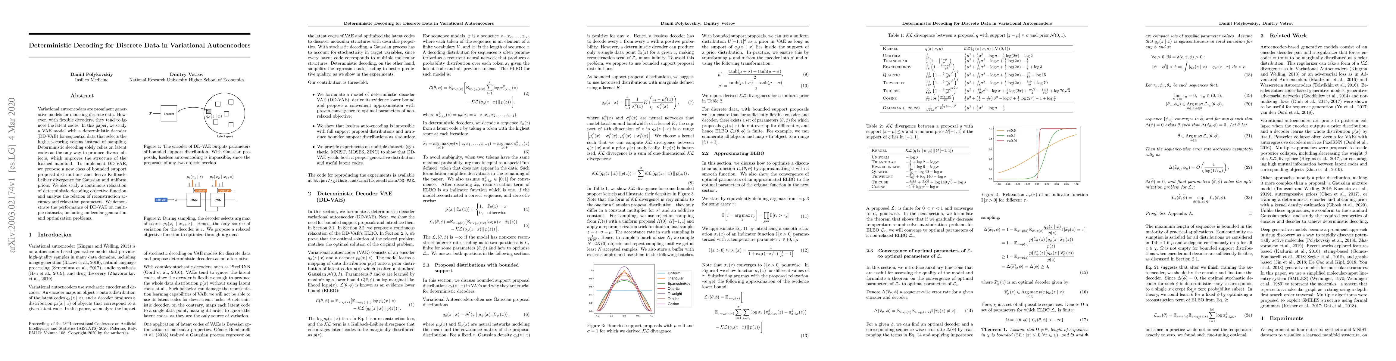 This paper proposes a deterministic decoding approach for variational autoencoders (DD-VAE) to improve modeling of discrete data by selecting the highest-scoring tokens instead of sampling, enhancing the learned manifold's structure. The authors introduce new bounded support proposal distributions and analyze the relationship between reconstruction accuracy and relaxation parameters.