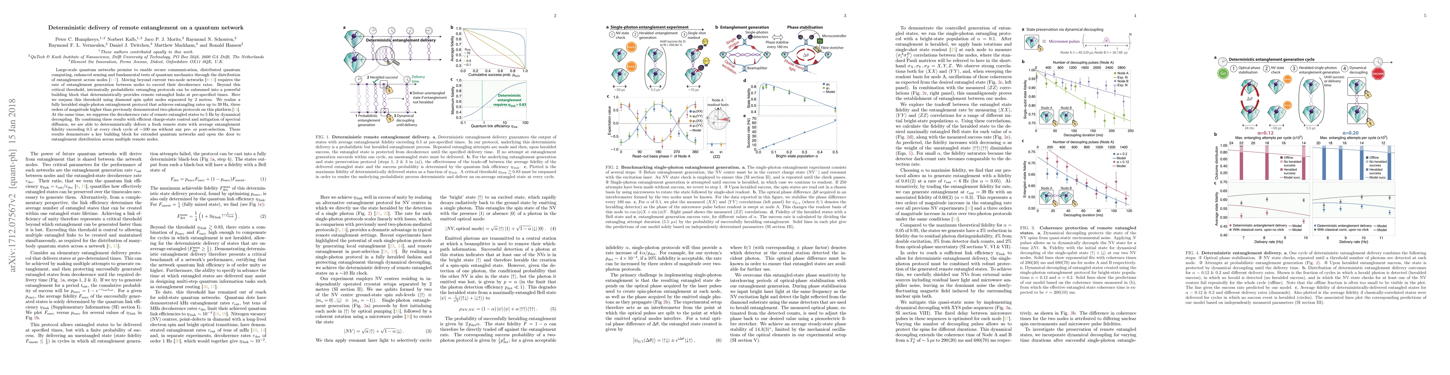 This paper reports the successful deterministic delivery of remote entanglement on a quantum network, achieving entangling rates three orders of magnitude higher than previous methods. The use of diamond spin qubit nodes and advanced protocols enables entanglement fidelity exceeding 0.5 at every 100 ms cycle, surpassing decoherence rates and paving the way for large-scale quantum networks.