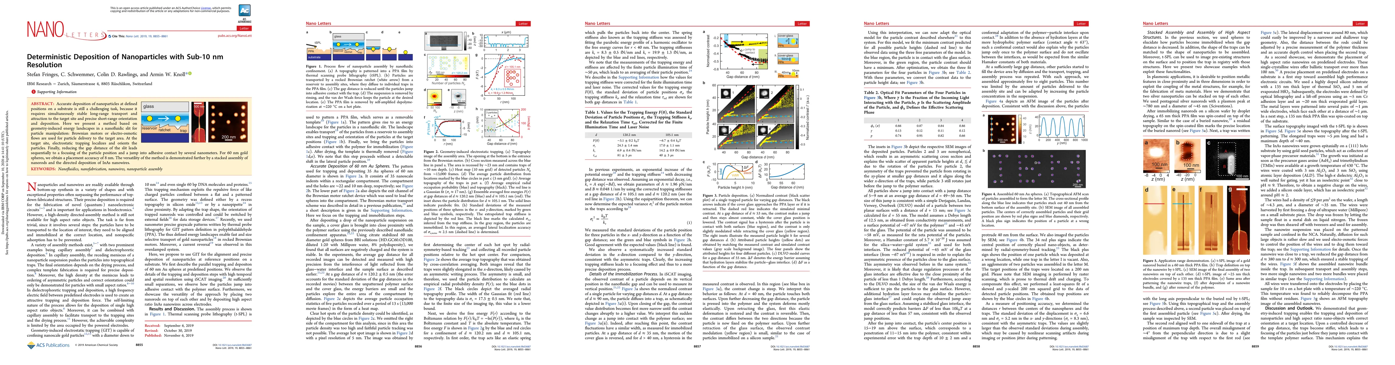 This paper presents a method for precise nanoparticle deposition using a nanofluidic slit with geometry-induced energy landscapes, employing Brownian motors or electro-osmotic flows for transport and electrostatic trapping for orientation. The technique achieves a placement accuracy of 8 nm for 60 nm gold spheres and demonstrates versatility with nanorods and InAs nanowires.
