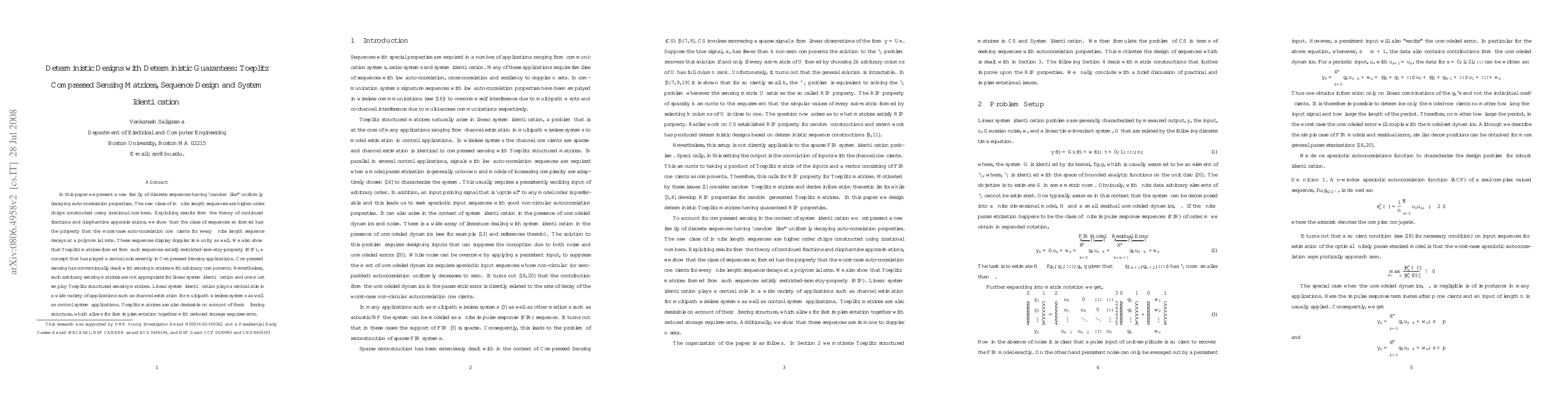 In this paper we present a new family of discrete sequences having "random like" uniformly decaying auto-correlation properties. The new class of infinite length sequences are higher order chirps constructed using irrational numbers. Exploiting results from the theory of continued fractions and diophantine approximations, we show that the class of sequences so formed has the property that the worst-case auto-correlation coefficients for every finite length sequence decays at a polynomial rate. These sequences display doppler immunity as well. We also show that Toeplitz matrices formed from such sequences satisfy restricted-isometry-property (RIP), a concept that has played a central role recently in Compressed Sensing applications. Compressed sensing has conventionally dealt with sensing matrices with arbitrary components. Nevertheless, such arbitrary sensing matrices are not appropriate for linear system identification and one must employ Toeplitz structured sensing matrices. Linear system identification plays a central role in a wide variety of applications such as channel estimation for multipath wireless systems as well as control system applications. Toeplitz matrices are also desirable on account of their filtering structure, which allows for fast implementation together with reduced storage requirements.