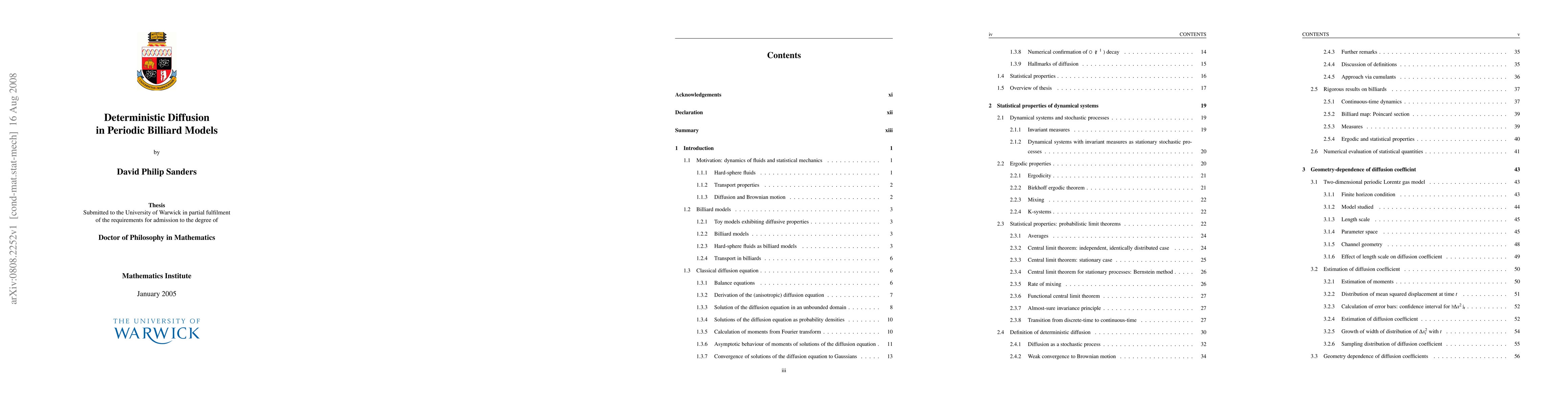 This paper explores the statistical properties of diffusive periodic billiard models, examining the geometry dependence of diffusion coefficients, the shape of position and displacement distributions, and the transition between normal and anomalous diffusion in both 2D and 3D models. It proposes a refined central limit theorem and discusses the impact of configuration space holes on diffusion.