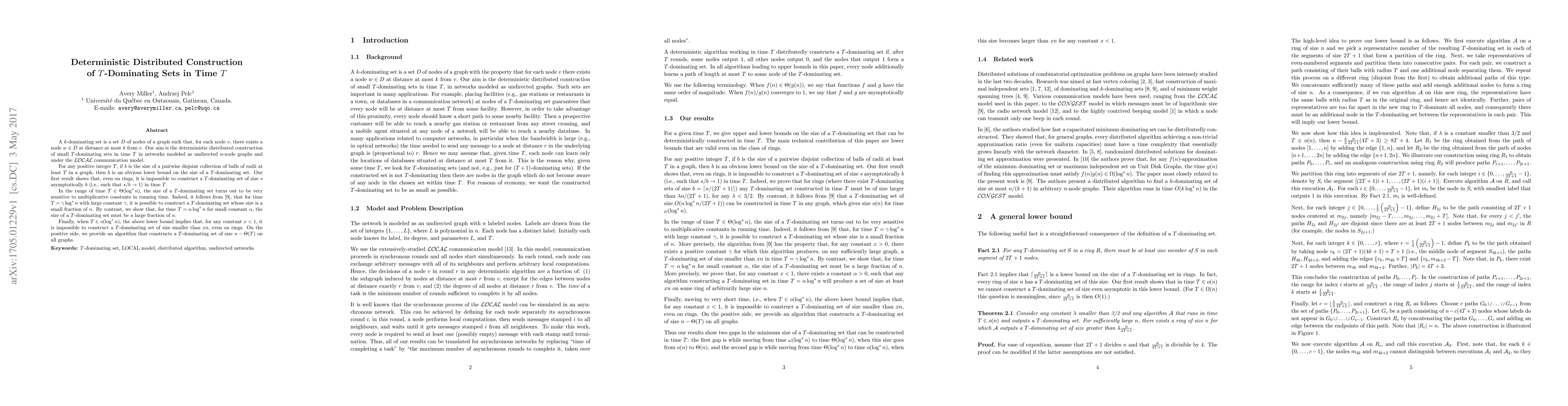 A $k$-dominating set is a set $D$ of nodes of a graph such that, for each node $v$, there exists a node $w \in D$ at distance at most $k$ from $v$. Our aim is the deterministic distributed construction of small $T$-dominating sets in time $T$ in networks modeled as undirected $n$-node graphs and under the $\cal{LOCAL}$ communication model. For any positive integer $T$, if $b$ is the size of a pairwise disjoint collection of balls of radii at least $T$ in a graph, then $b$ is an obvious lower bound on the size of a $T$-dominating set. Our first result shows that, even on rings, it is impossible to construct a $T$-dominating set of size $s$ asymptotically $b$ (i.e., such that $s/b \rightarrow 1$) in time $T$. In the range of time $T \in \Theta (\log^* n)$, the size of a $T$-dominating set turns out to be very sensitive to multiplicative constants in running time. Indeed, it follows from \cite{KP}, that for time $T=\gamma \log^* n$ with large constant $\gamma$, it is possible to construct a $T$-dominating set whose size is a small fraction of $n$. By contrast, we show that, for time $T=\alpha \log^* n $ for small constant $\alpha$, the size of a $T$-dominating set must be a large fraction of $n$. Finally, when $T \in o (\log^* n)$, the above lower bound implies that, for any constant $x<1$, it is impossible to construct a $T$-dominating set of size smaller than $xn$, even on rings. On the positive side, we provide an algorithm that constructs a $T$-dominating set of size $n- \Theta(T)$ on all graphs.