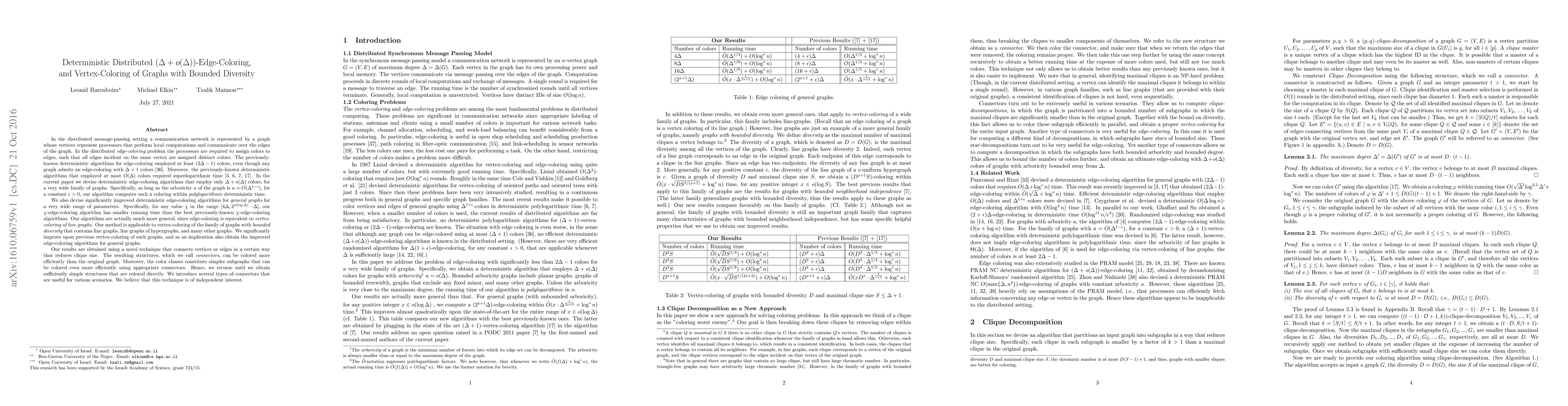 This paper presents deterministic algorithms for edge-coloring and vertex-coloring of graphs with bounded diversity, employing Delta + o(Delta) colors in polylogarithmic time for graphs with arboricity O(Delta^(1 - epsilon)), and improved algorithms for general graphs within a wide range of parameters. The method uses connectors to reduce clique size and simplify coloring.