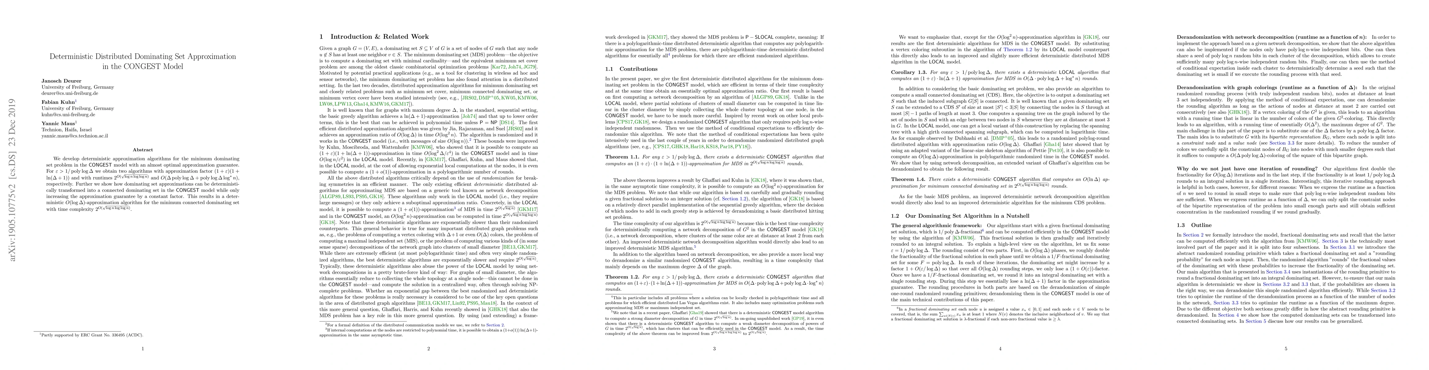 This paper presents deterministic algorithms for the minimum dominating set problem in the CONGEST model, achieving an approximation factor of $(1+\epsilon)(1+\ln (\Delta+1))$ with runtimes $2^{O(\sqrt{\log n \log\log n})}$ and $O(\Delta\cdot\text{poly}\log \Delta+\text{poly}\log \Delta \log^{*} n)$. It also transforms dominating set approximations into connected dominating sets with a constant factor increase in approximation.
