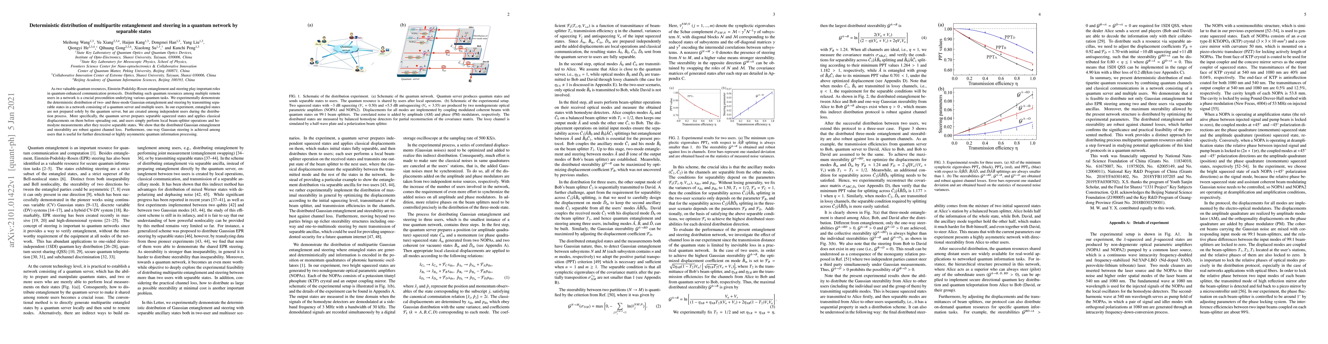 As two valuable quantum resources, Einstein-Podolsky-Rosen entanglement and steering play important roles in quantum-enhanced communication protocols. Distributing such quantum resources among multiple remote users in a network is a crucial precondition underlying various quantum tasks. We experimentally demonstrate the deterministic distribution of two- and three-mode Gaussian entanglement and steering by transmitting separable states in a network consisting of a quantum server and multiple users. In our experiment, entangled states are not prepared solely by the quantum server, but are created among independent users during the distribution process. More specifically, the quantum server prepares separable squeezed states and applies classical displacements on them before spreading out, and users simply perform local beam-splitter operations and homodyne measurements after they receive separable states. We show that the distributed Gaussian entanglement and steerability are robust against channel loss. Furthermore, one-way Gaussian steering is achieved among users that is useful for further directional or highly asymmetric quantum information processing.