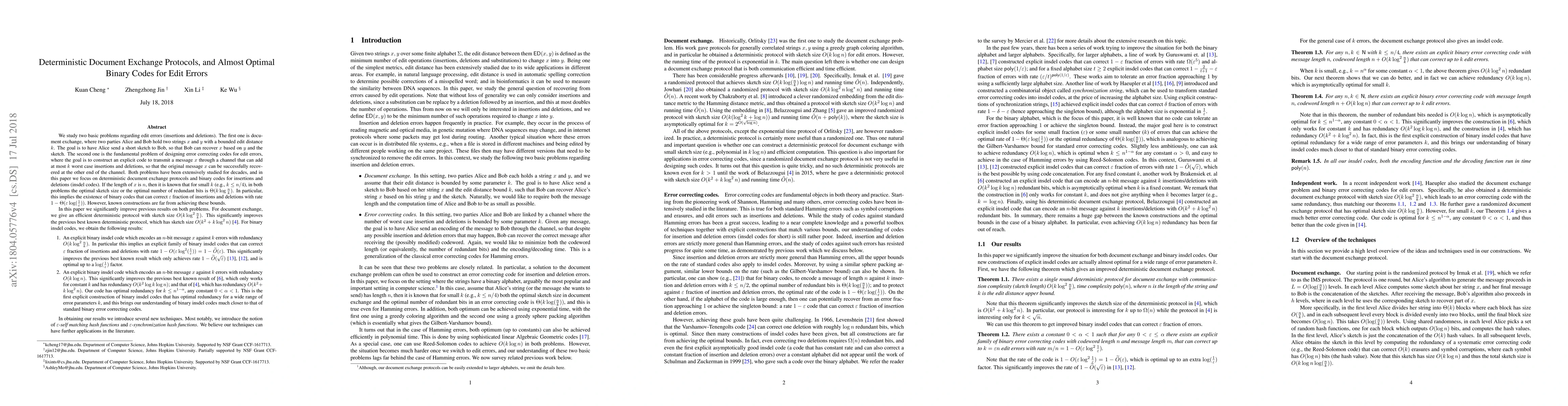 This paper presents significant improvements in deterministic document exchange protocols and binary insertion-deletion (insdel) codes for edit errors. The authors propose an efficient protocol with sketch size $O(k\log^2 \frac{n}{k})$ and introduce explicit binary insdel codes with optimal redundancy, advancing the understanding of these codes.