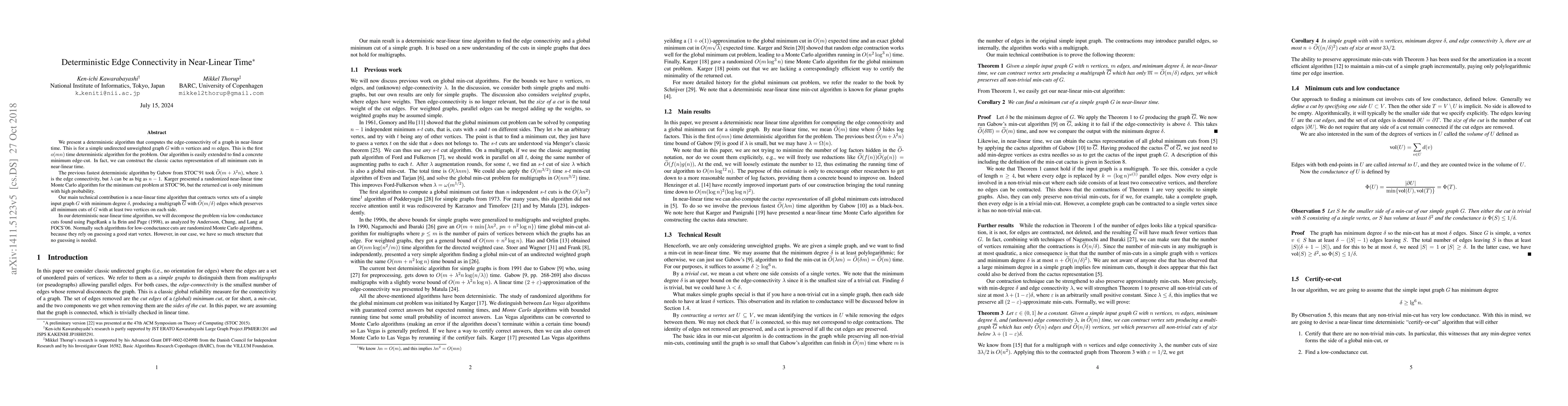 This research introduces a deterministic near-linear time algorithm for computing edge-connectivity and finding minimum cuts in simple undirected unweighted graphs, marking the first such o(mn) time solution. The method leverages vertex set contractions and low-conductance cuts derived from PageRank, eliminating the need for random guessing.