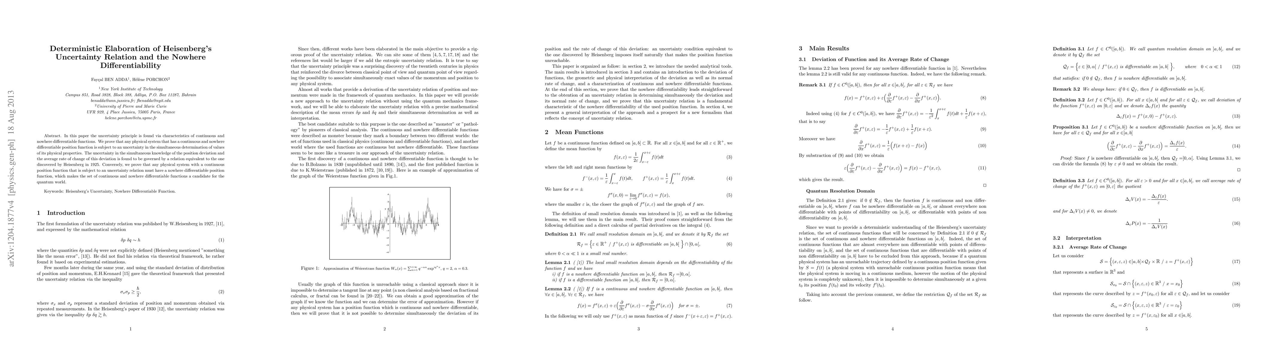 In this paper the uncertainty principle is found via characteristics of continuous and nowhere differentiable functions. We prove that any physical system that has a continuous and nowhere differentiable position function is subject to an uncertainty in the simultaneous determination of values of its physical properties. The uncertainty in the simultaneous knowledge of the position deviation and the average rate of change of this deviation is found to be governed by a relation equivalent to the one discovered by Heisenberg in 1925. Conversely, we prove that any physical system with a continuous position function that is subject to an uncertainty relation must have a nowhere differentiable position function, which makes the set of continuous and nowhere differentiable functions a candidate for the quantum world.
