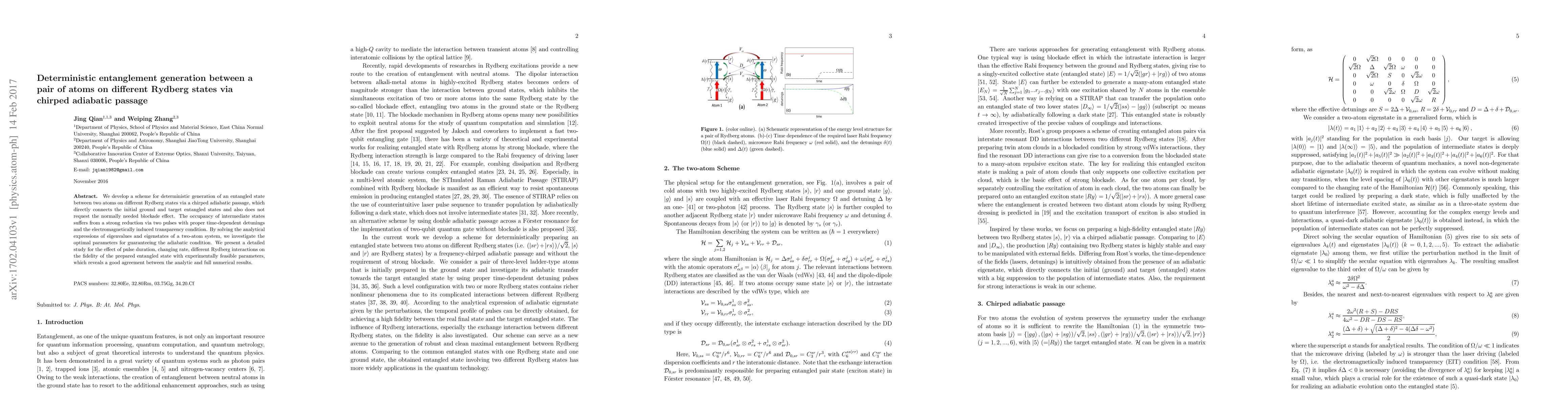 This paper proposes a method for deterministically generating entangled states between two atoms on different Rydberg states using chirped adiabatic passage, bypassing the need for blockade effects. The scheme employs two pulses with time-dependent detunings to minimize intermediate state occupancy and optimizes parameters for high fidelity, showing good agreement between analytical and numerical results.