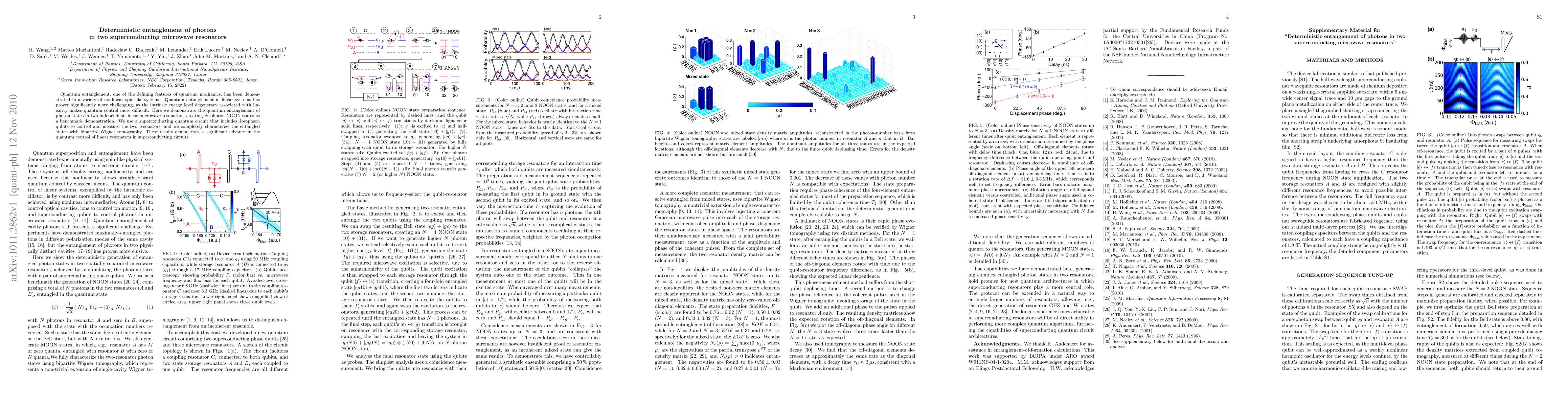 This paper demonstrates the entanglement of photon states in two superconducting microwave resonators using a superconducting quantum circuit with Josephson qubits, achieving N-photon NOON states. The entangled states are fully characterized using bipartite Wigner tomography, marking a significant advancement in quantum control of linear systems.