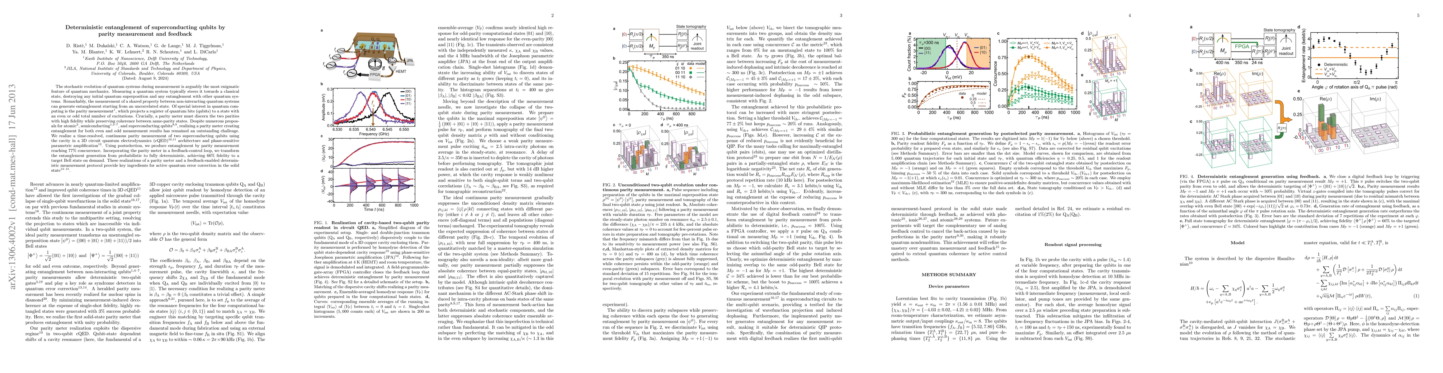 This paper demonstrates the deterministic entanglement of superconducting qubits via a parity measurement and feedback control, achieving 66% fidelity to a target Bell state. The researchers utilize a 3D cQED architecture and phase-sensitive parametric amplification to create a time-resolved parity meter, transforming entanglement generation from probabilistic to fully deterministic.