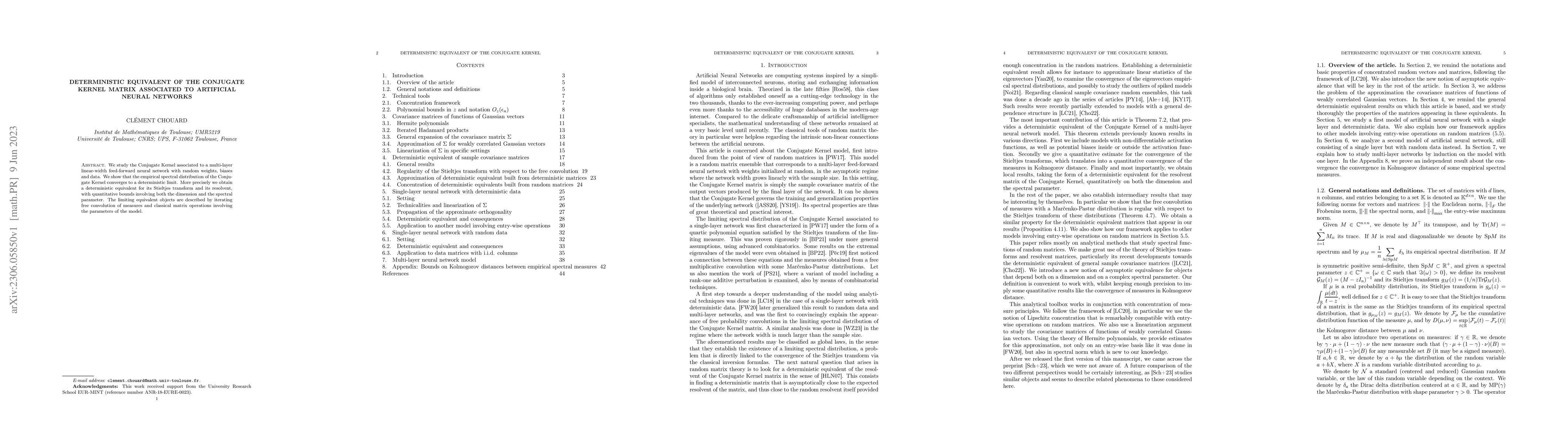 This paper explores the Conjugate Kernel linked to a multi-layer neural network with random components, demonstrating that its empirical spectral distribution converges to a deterministic limit. The study provides a deterministic equivalent for its Stieltjes transform and resolvent, with bounds tied to the network's dimension and spectral parameter.