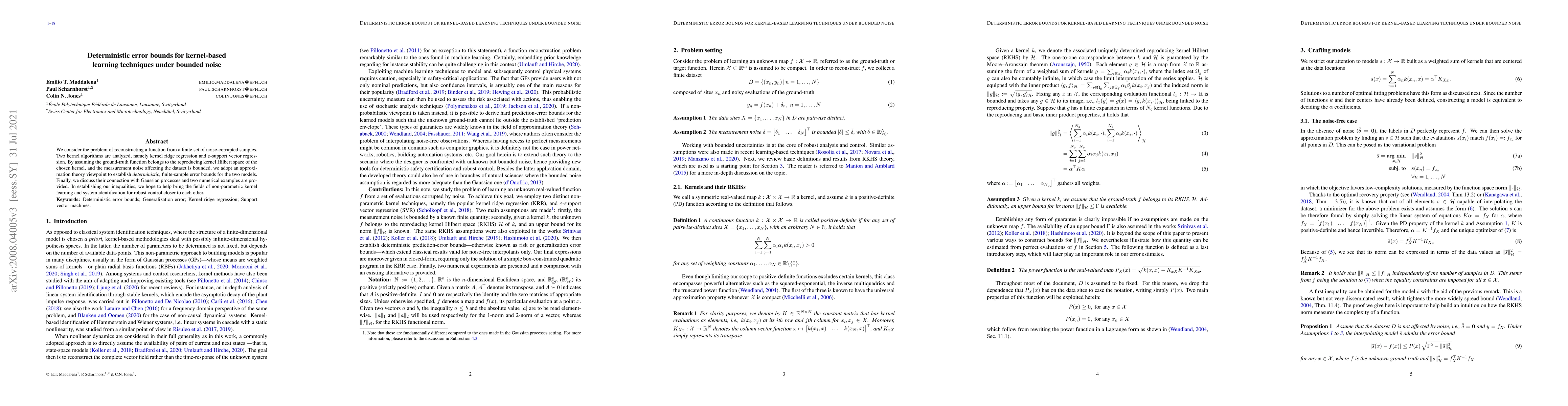 This paper establishes deterministic error bounds for kernel ridge regression and $\varepsilon$-support vector regression under bounded noise, assuming the ground-truth function lies in the reproducing kernel Hilbert space. It aims to bridge non-parametric kernel learning and robust control system identification through approximation theory.