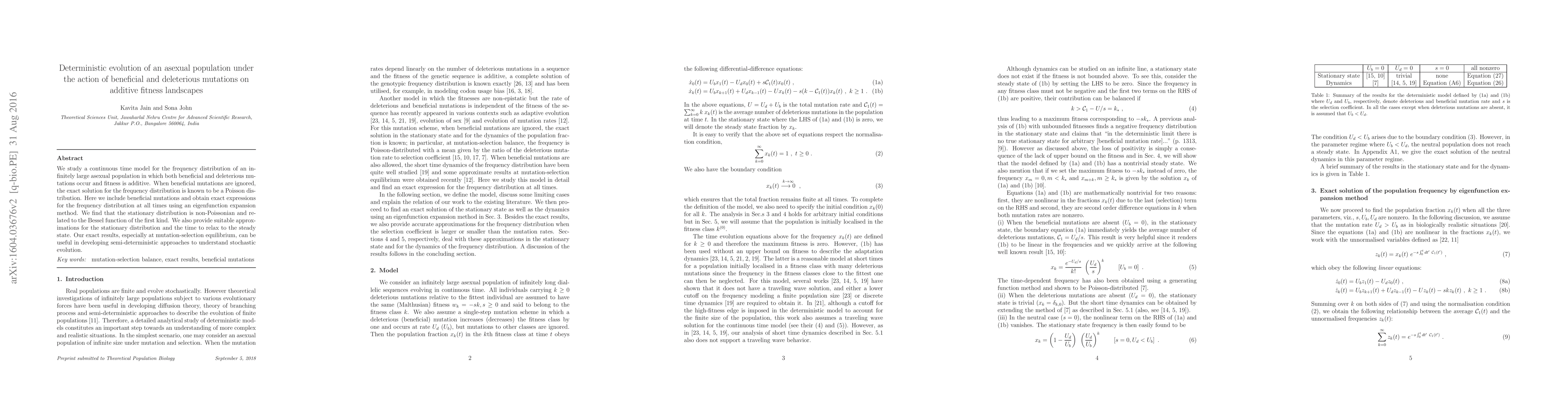 We study a continuous time model for the frequency distribution of an infinitely large asexual population in which both beneficial and deleterious mutations occur and the fitness is additive. When beneficial mutations are ignored, the exact solution for the frequency distribution is known to be a Poisson distribution. Here we include beneficial mutations and obtain exact expressions for the frequency distribution at all times using an eigenfunction expansion method. We find that the stationary distribution is non-Poissonian and related to the Bessel function of the first kind. We also provide suitable approximations for the stationary distribution and the time to relax to the steady state. Our exact results, especially at mutation-selection equilibrium, can be useful in developing semi-deterministic approaches to understand stochastic evolution.