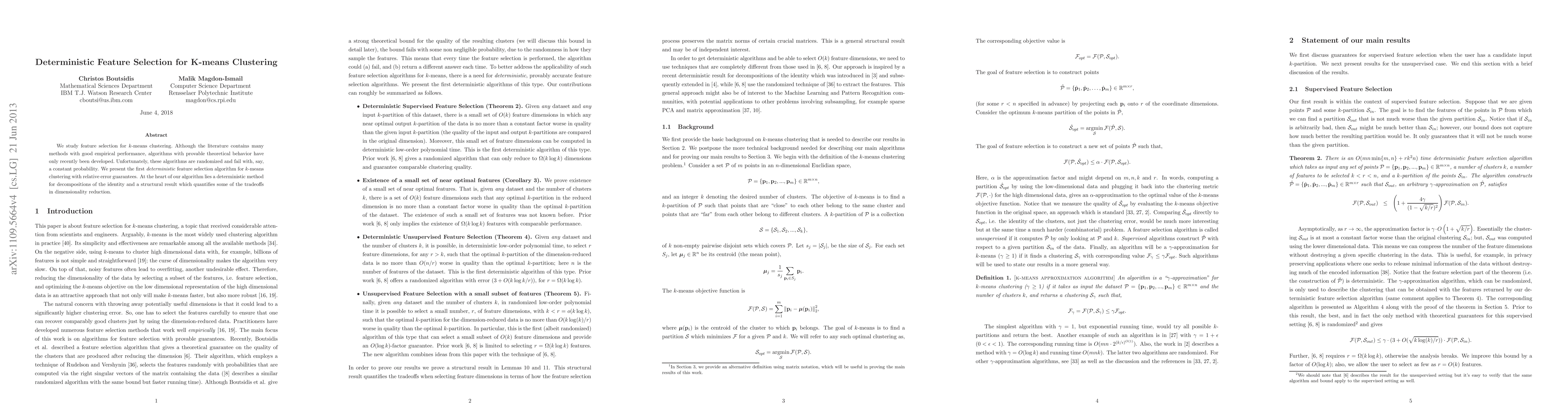 This paper introduces a deterministic feature selection algorithm for $k$-means clustering that provides theoretical guarantees, addressing the limitations of existing randomized algorithms which may fail with a constant probability. The algorithm's core relies on a deterministic method for decompositions of the identity.