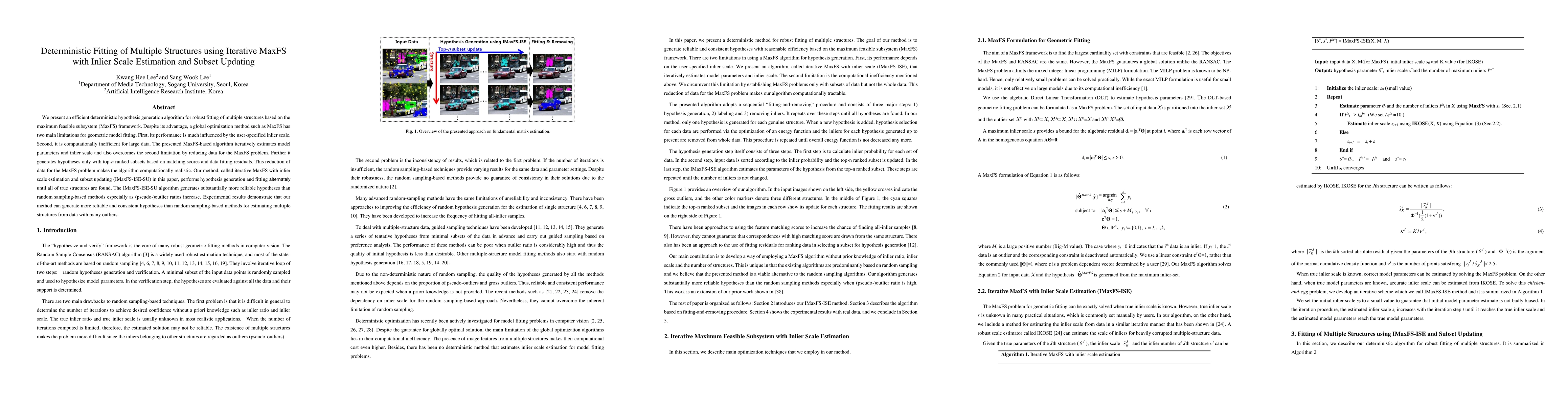 We present an efficient deterministic hypothesis generation algorithm for robust fitting of multiple structures based on the maximum feasible subsystem (MaxFS) framework. Despite its advantage, a global optimization method such as MaxFS has two main limitations for geometric model fitting. First, its performance is much influenced by the user-specified inlier scale. Second, it is computationally inefficient for large data. The presented MaxFS-based algorithm iteratively estimates model parameters and inlier scale and also overcomes the second limitation by reducing data for the MaxFS problem. Further it generates hypotheses only with top-n ranked subsets based on matching scores and data fitting residuals. This reduction of data for the MaxFS problem makes the algorithm computationally realistic. Our method, called iterative MaxFS with inlier scale estimation and subset updating (IMaxFS-ISE-SU) in this paper, performs hypothesis generation and fitting alternately until all of true structures are found. The IMaxFS-ISE-SU algorithm generates substantially more reliable hypotheses than random sampling-based methods especially as (pseudo-)outlier ratios increase. Experimental results demonstrate that our method can generate more reliable and consistent hypotheses than random sampling-based methods for estimating multiple structures from data with many outliers.