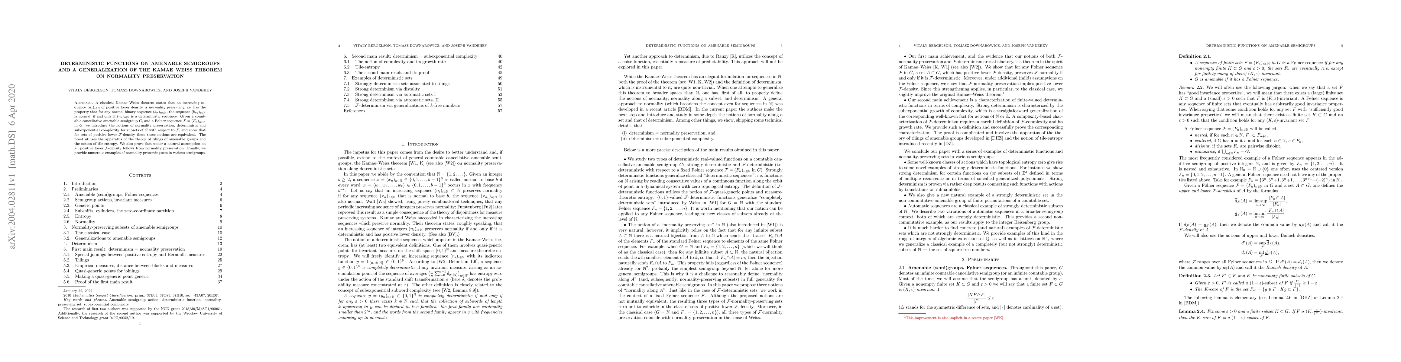 A classical Kamae-Weiss theorem states that an increasing sequence $(n_i)_{i\in\mathbb N}$ of positive lower density is \emph{normality preserving}, i.e. has the property that for any normal binary sequence $(b_n)_{n\in\mathbb N}$, the sequence $(b_{n_i})_{i\in\mathbb N}$ is normal, if and only if $(n_i)_{i\in\mathbb N}$ is a deterministic sequence. Given a countable cancellative amenable semigroup $G$, and a F\o lner sequence $\mathcal F=(F_n)_{n\in\mathbb N}$ in $G$, we introduce the notions of normality preservation, determinism and subexponential complexity for subsets of $G$ with respect to $\mathcal F$, and show that for sets of positive lower $\mathcal F$-density these three notions are equivalent. The proof utilizes the apparatus of the theory of tilings of amenable groups and the notion of tile-entropy. We also prove that under a natural assumption on $\mathcal F$, positive lower $\mathcal F$-density follows from normality preservation. Finally, we provide numerous examples of normality preserving sets in various semigroups