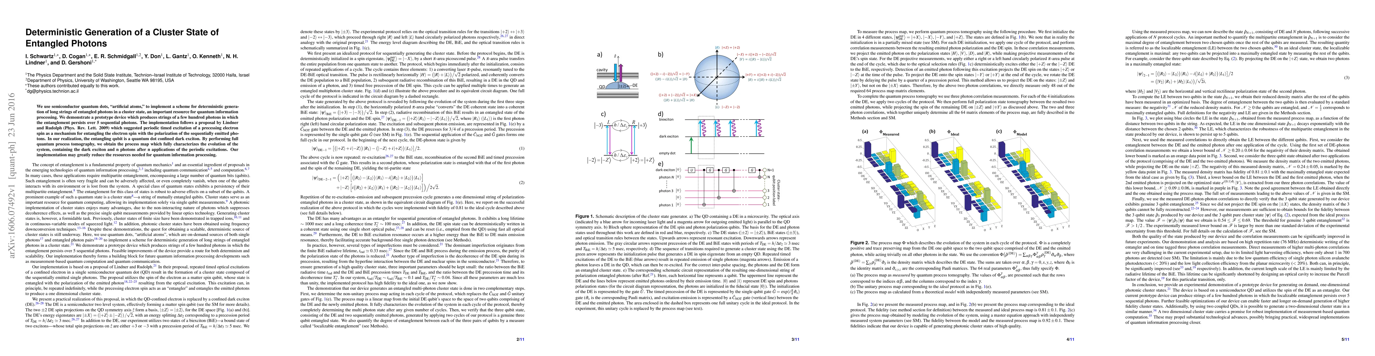 We use semiconductor quantum dots, "artificial atoms," to implement a scheme for deterministic generation of long strings of entangled photons in a cluster state, an important resource for quantum information processing. We demonstrate a prototype device which produces strings of a few hundred photons in which the entanglement persists over 5 sequential photons. The implementation follows a proposal by Lindner and Rudolph (Phys. Rev. Lett. 2009) which suggested periodic timed excitation of a precessing electron spin as a mechanism for entangling the electron spin with the polarization of the sequentially emitted photons. In our realization, the entangling qubit is a quantum dot confined dark exciton. By performing full quantum process tomography, we obtain the process map which fully characterizes the evolution of the system, containing the dark exciton and n photons after n applications of the periodic excitations. Our implementation may greatly reduce the resources needed for quantum information processing.