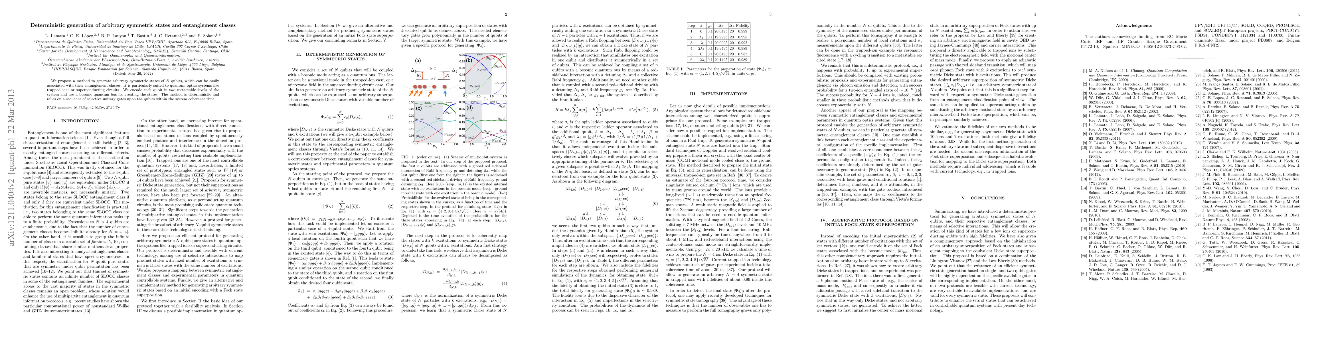 This paper proposes a deterministic method for generating arbitrary symmetric states of N qubits using selective unitary gates and a bosonic quantum bus, suitable for quantum optics systems like trapped ions or superconducting circuits. The method is designed to easily associate these states with their entanglement classes.