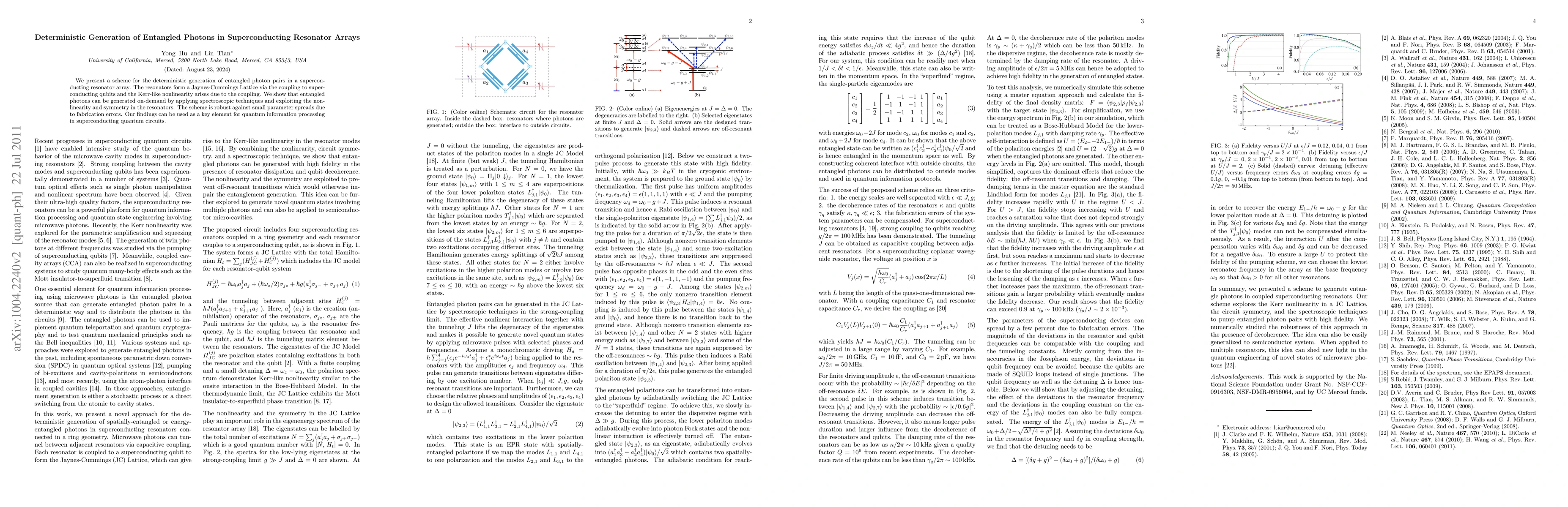 This paper proposes a method for generating entangled photon pairs deterministically using a superconducting resonator array. The array's nonlinearity and symmetry enable on-demand entanglement generation, making it robust against fabrication errors and a potential component for quantum information processing.