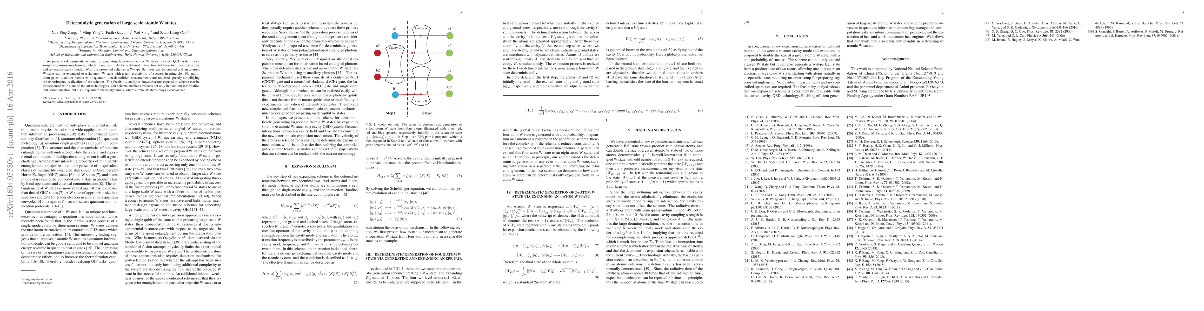 This paper proposes a deterministic method for generating large-scale atomic W states in cavity QED systems using a detuned interaction between two atoms and a cavity mode, without requiring complex quantum operations. The scheme can expand n-atom W states to 2n-atom W states with a 100% success rate, simplifying experimental setups and enabling advancements in quantum information and thermodynamics.