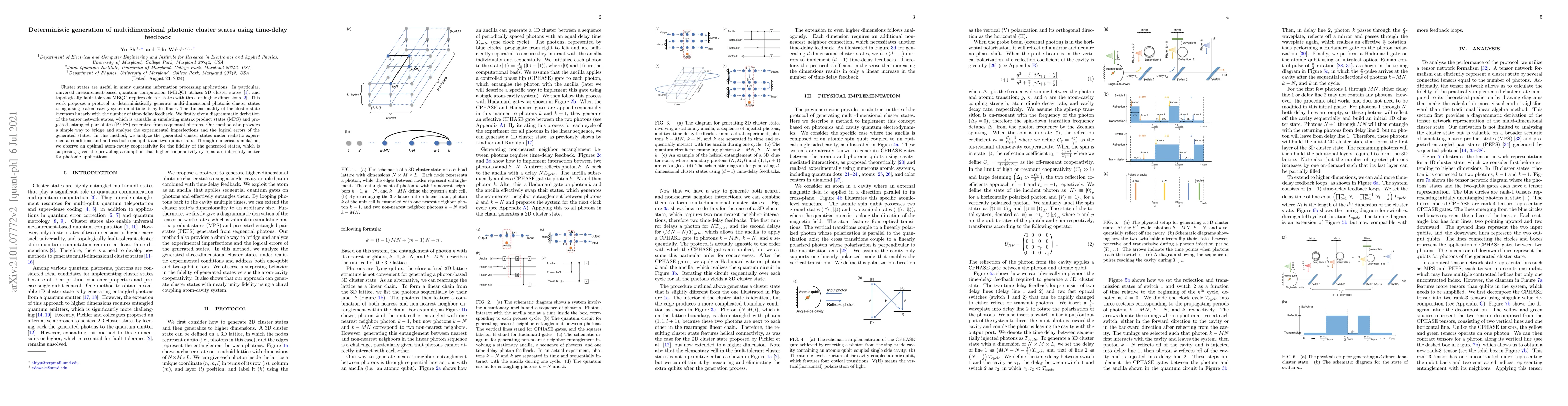 This paper proposes a protocol for deterministically generating multidimensional photonic cluster states using time-delay feedback from a single atom-cavity system. The method provides a way to bridge experimental imperfections and analyze logical errors, revealing an optimal atom-cavity cooperativity for state fidelity contrary to common assumptions.
