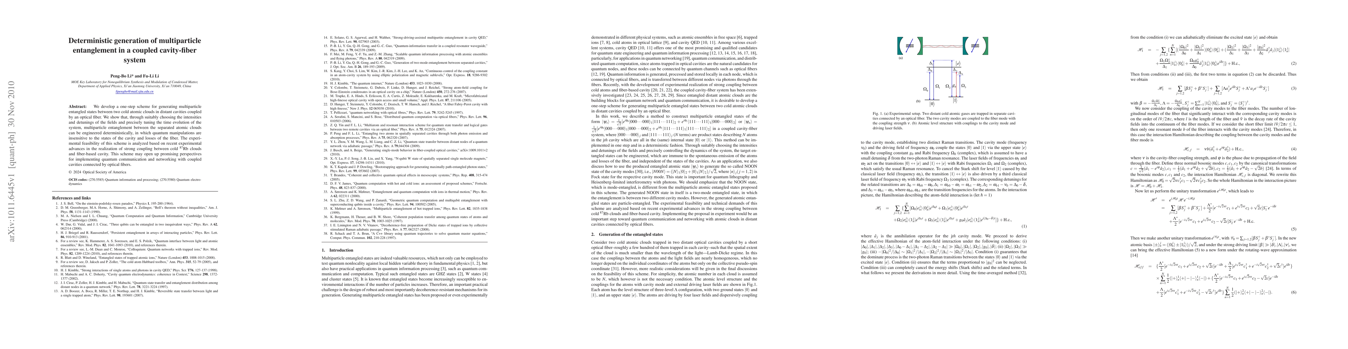 This paper proposes a deterministic method for generating multiparticle entangled states between two distant atomic clouds via coupled cavities connected by an optical fiber, achieving entanglement through precise tuning of field intensities and time evolution, while remaining robust against cavity states and fiber losses. The feasibility of this scheme is discussed in light of recent advancements in strong coupling with cold $^{87}$Rb clouds.