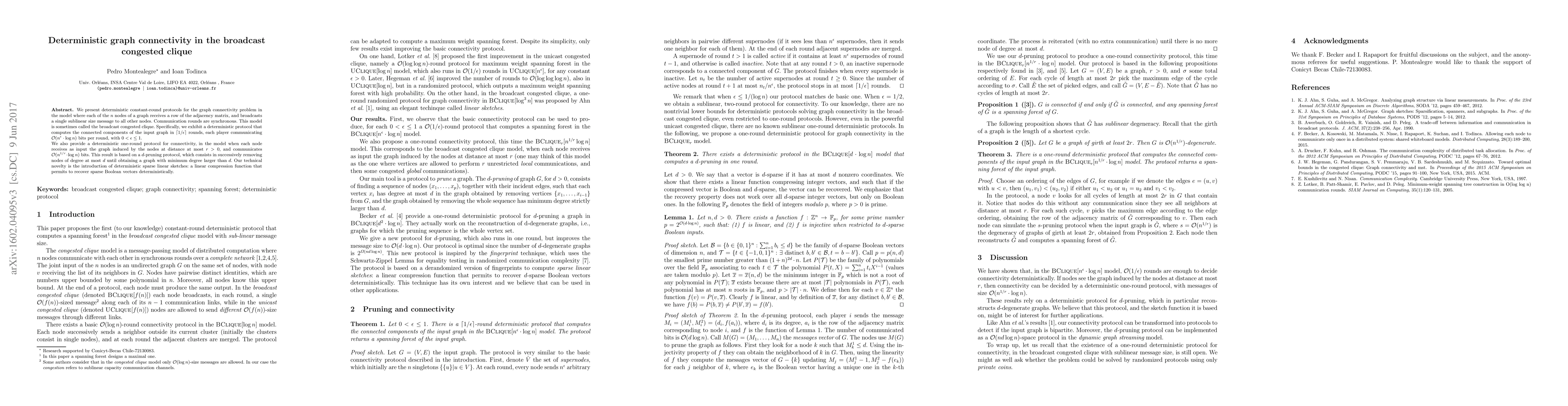 The research presents deterministic constant-round protocols for graph connectivity in the broadcast congested clique model, where nodes receive a row of the adjacency matrix and broadcast sublinear messages.