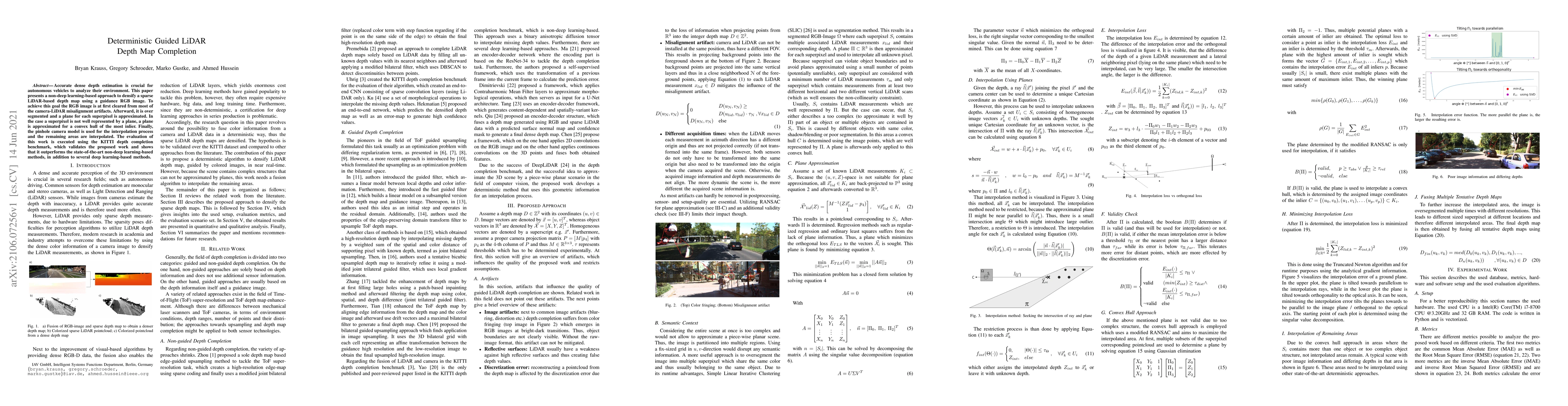 Accurate dense depth estimation is crucial for autonomous vehicles to analyze their environment. This paper presents a non-deep learning-based approach to densify a sparse LiDAR-based depth map using a guidance RGB image. To achieve this goal the RGB image is at first cleared from most of the camera-LiDAR misalignment artifacts. Afterward, it is over segmented and a plane for each superpixel is approximated. In the case a superpixel is not well represented by a plane, a plane is approximated for a convex hull of the most inlier. Finally, the pinhole camera model is used for the interpolation process and the remaining areas are interpolated. The evaluation of this work is executed using the KITTI depth completion benchmark, which validates the proposed work and shows that it outperforms the state-of-the-art non-deep learning-based methods, in addition to several deep learning-based methods.