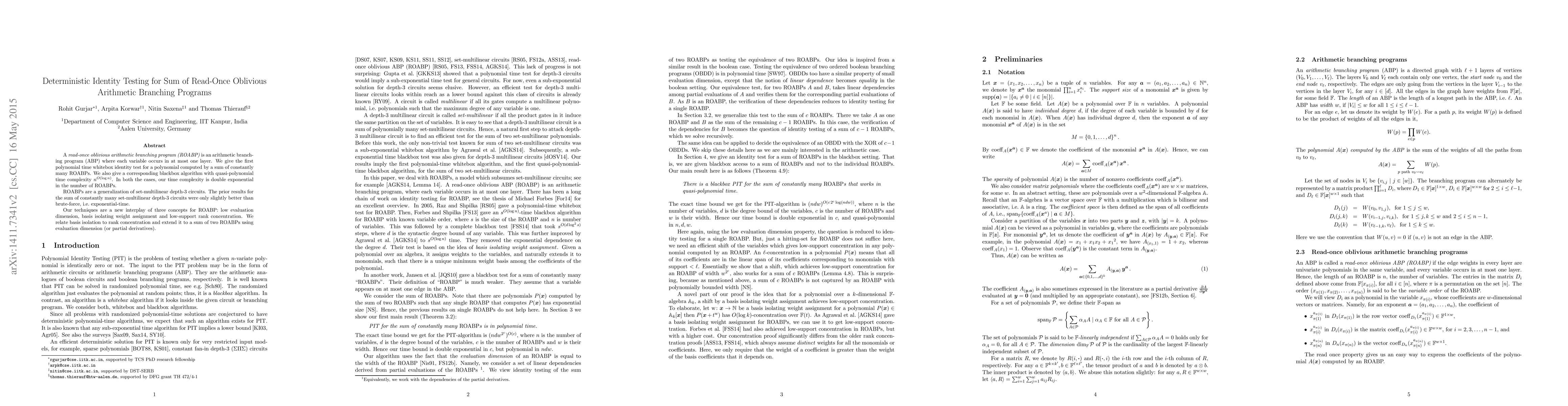 A read-once oblivious arithmetic branching program (ROABP) is an arithmetic branching program (ABP) where each variable occurs in at most one layer. We give the first polynomial time whitebox identity test for a polynomial computed by a sum of constantly many ROABPs. We also give a corresponding blackbox algorithm with quasi-polynomial time complexity $n^{O(\log n)}$. In both the cases, our time complexity is double exponential in the number of ROABPs. ROABPs are a generalization of set-multilinear depth-$3$ circuits. The prior results for the sum of constantly many set-multilinear depth-$3$ circuits were only slightly better than brute-force, i.e. exponential-time. Our techniques are a new interplay of three concepts for ROABP: low evaluation dimension, basis isolating weight assignment and low-support rank concentration. We relate basis isolation to rank concentration and extend it to a sum of two ROABPs using evaluation dimension (or partial derivatives).
