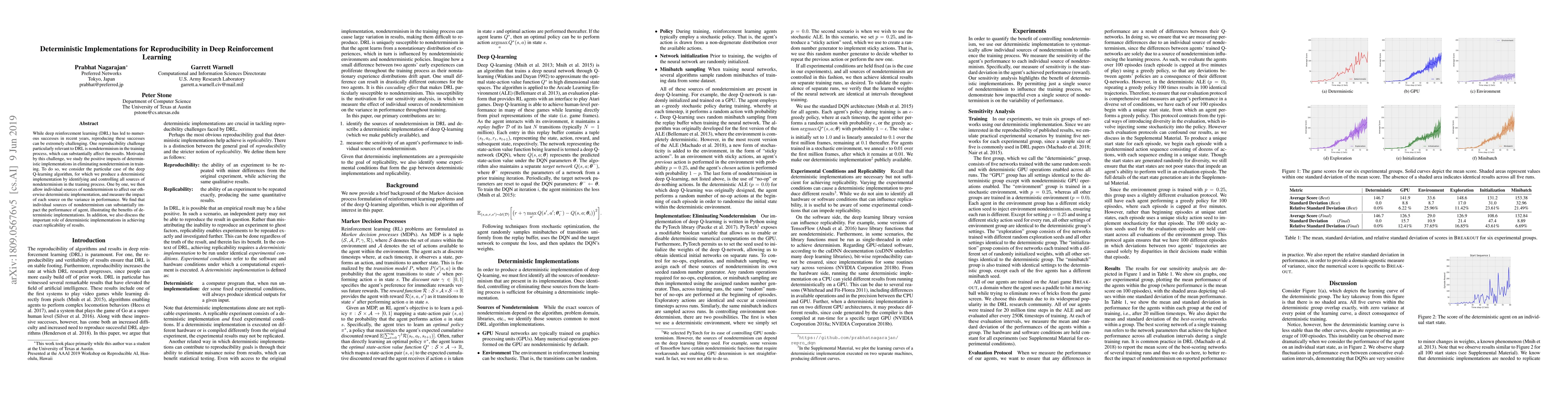 This paper investigates the impact of deterministic implementations on reproducibility in deep reinforcement learning (DRL) by focusing on deep Q-learning. It finds that eliminating nondeterminism significantly reduces performance variance, highlighting the importance of exact replicability in DRL research.