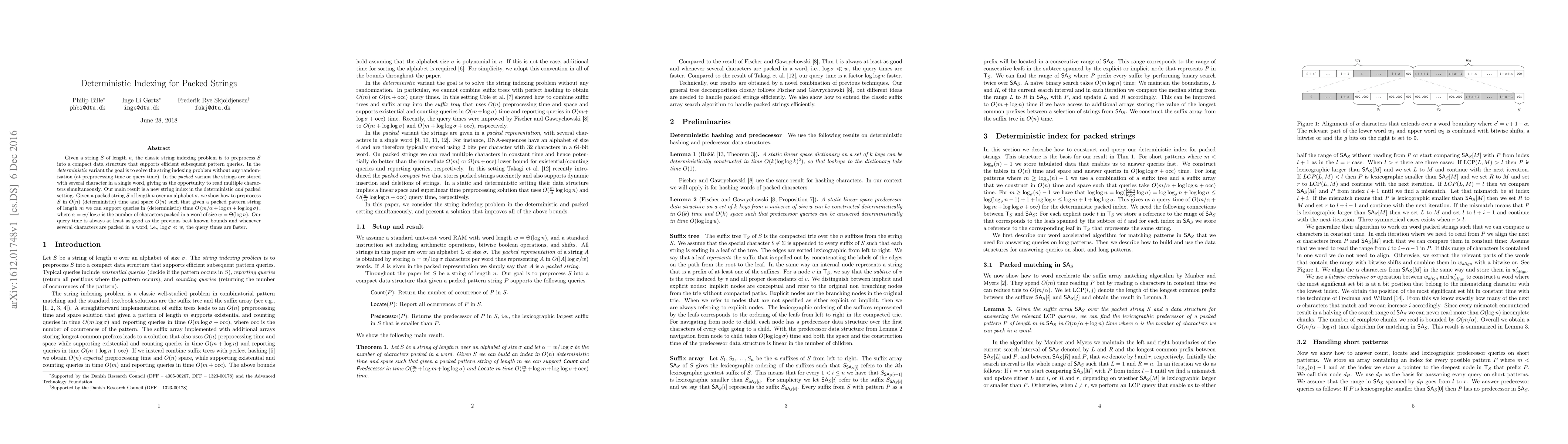 The research presents a deterministic index for packed strings, constructed using a suffix tree and suffix array, with word-level parallelism for efficient pattern matching.