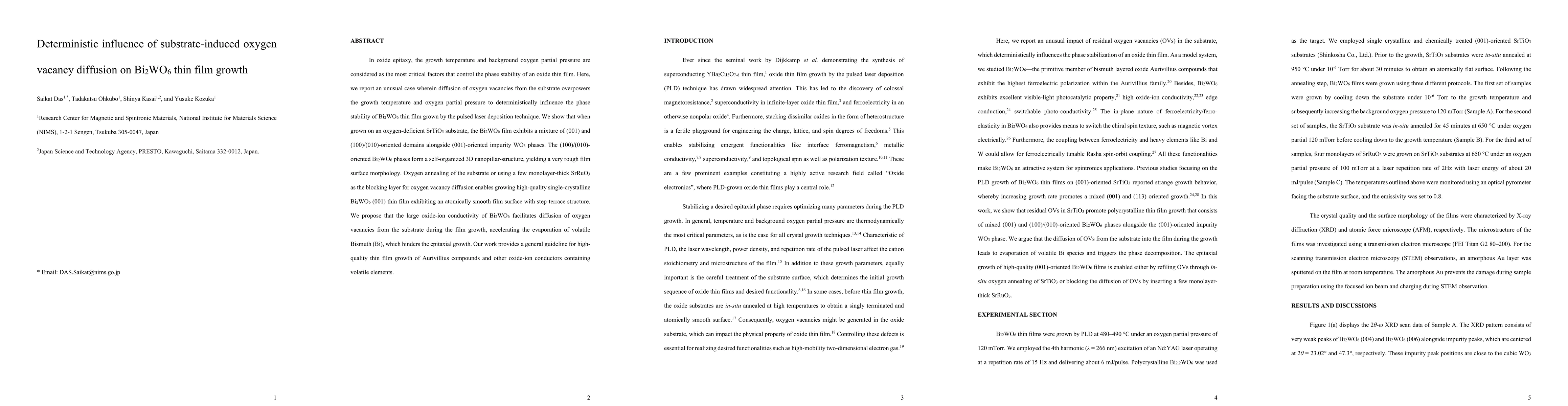 In oxide epitaxy, the growth temperature and background oxygen partial pressure are considered as the most critical factors that control the phase stability of an oxide thin film. Here, we report an unusual case wherein diffusion of oxygen vacancies from the substrate overpowers the growth temperature and oxygen partial pressure to deterministically influence the phase stability of $Bi_{2}WO_{6}$ thin film grown by the pulsed laser deposition technique. We show that when grown on an oxygen-deficient $SrTiO_{3}$ substrate, the $Bi_{2}WO_{6}$ film exhibits a mixture of (001) and (100)/(010)-oriented domains alongside (001)-oriented impurity $WO_{3}$ phases. The (100)/(010)-oriented $Bi_{2}WO_{6}$ phases form a self-organized 3D nanopillar-structure, yielding a very rough film surface morphology. Oxygen annealing of the substrate or using a few monolayer-thick $SrRuO_{3}$ as the blocking layer for oxygen vacancy diffusion enables growing high-quality single-crystalline $Bi_{2}WO_{6}$ (001) thin film exhibiting an atomically smooth film surface with step-terrace structure. We propose that the large oxide-ion conductivity of $Bi_{2}WO_{6}$ facilitates diffusion of oxygen vacancies from the substrate during the film growth, accelerating the evaporation of volatile Bismuth (Bi), which hinders the epitaxial growth. Our work provides a general guideline for high-quality thin film growth of Aurivillius compounds and other oxide-ion conductors containing volatile elements.