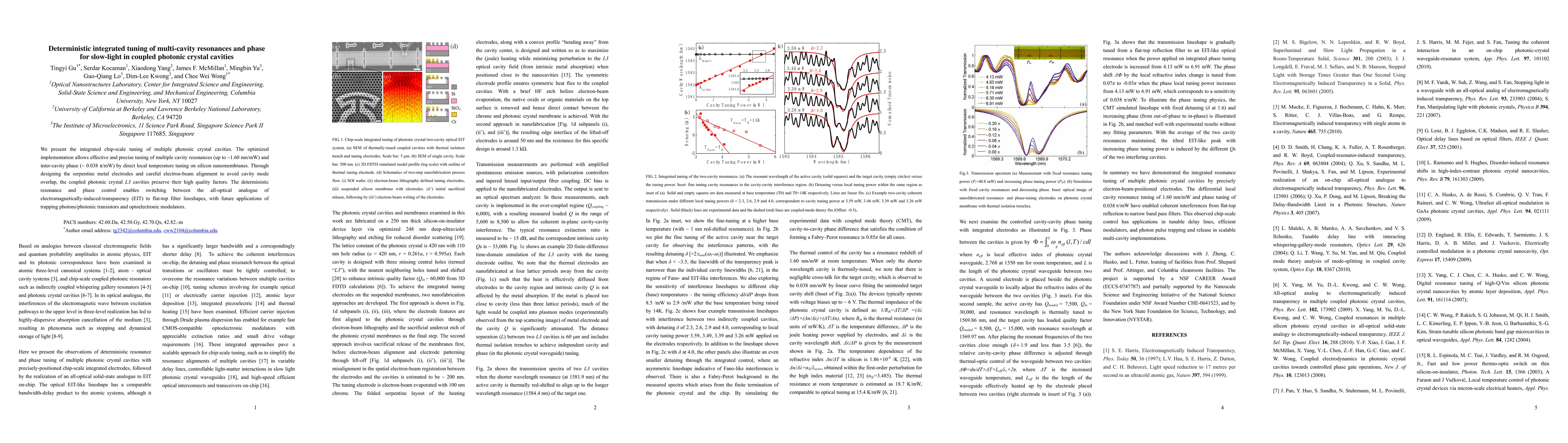 This paper details a chip-scale method for precise tuning of multiple photonic crystal cavities, achieving up to 1.60 nm/mW resonance and 0.038 pi/mW phase control via local temperature adjustments. The design maintains high quality factors and enables switching between EIT and flat-top filter lineshapes for potential photonic applications.