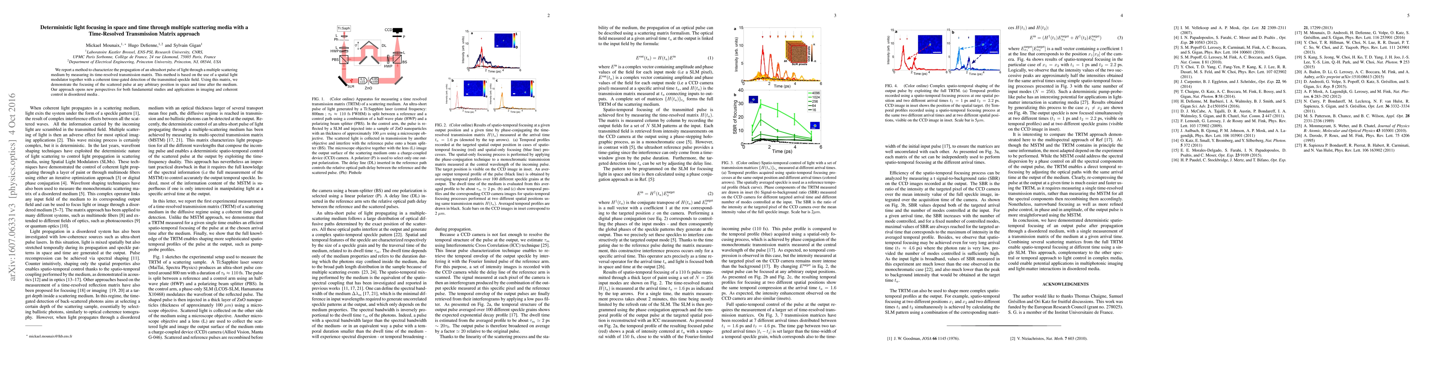 This paper presents a method to focus ultrashort light pulses through multiple scattering media by measuring a time-resolved transmission matrix, enabling precise control over the spatial and temporal distribution of the light after passing through the medium. This technique has potential applications in imaging and coherent control in disordered environments.