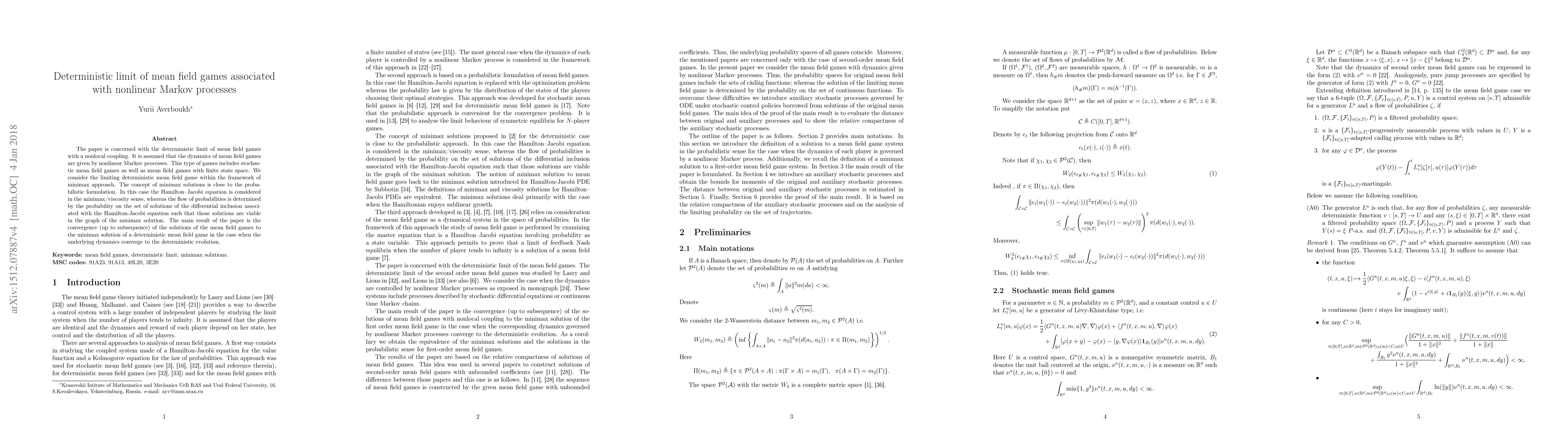 The paper is concerned with the deterministic limit of mean field games with the nonlocal coupling. It is assumed that the dynamics of mean field games are given by nonlinear Markov processes. This type of games includes stochastic mean field games as well as mean field games with finite state space. We consider the limiting deterministic mean field game within the framework of minimax approach. The concept of minimax solutions is close to the probabilistic formulation. In this case the Hamilton--Jacobi equation is considered in the minimax/viscosity sense, whereas the flow of probabilities is determined by the probability on the set of solutions of the differential inclusion associated with the Hamilton-Jacobi equation such that those solutions are viable in the graph of the minimax solution. The main result of the paper is the convergence (up to subsequence) of the solutions of the mean field games to the minimax solution of deterministic mean field game in the case when the underlying dynamics converge to the deterministic evolution.