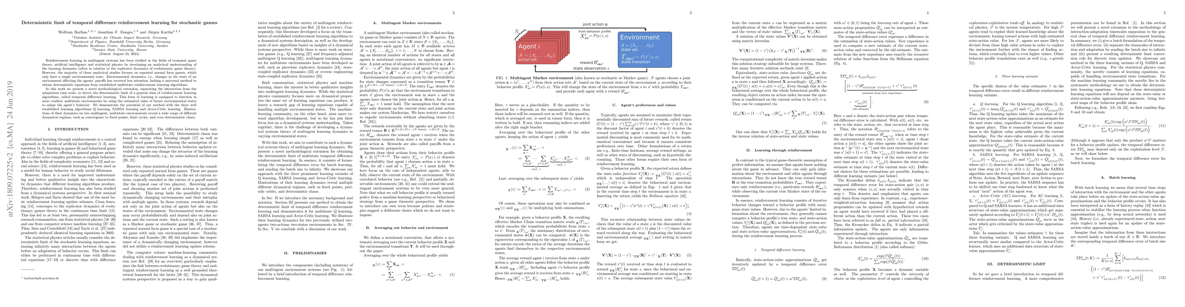 This paper introduces a novel method to derive deterministic limits for temporal difference reinforcement learning in stochastic multiagent systems, addressing the lack of analytical understanding in multistate environments. The proposed approach separates interaction and adaptation time scales, demonstrating its application to Q-learning, SARSA, and Actor-Critic methods, revealing diverse dynamical regimes.
