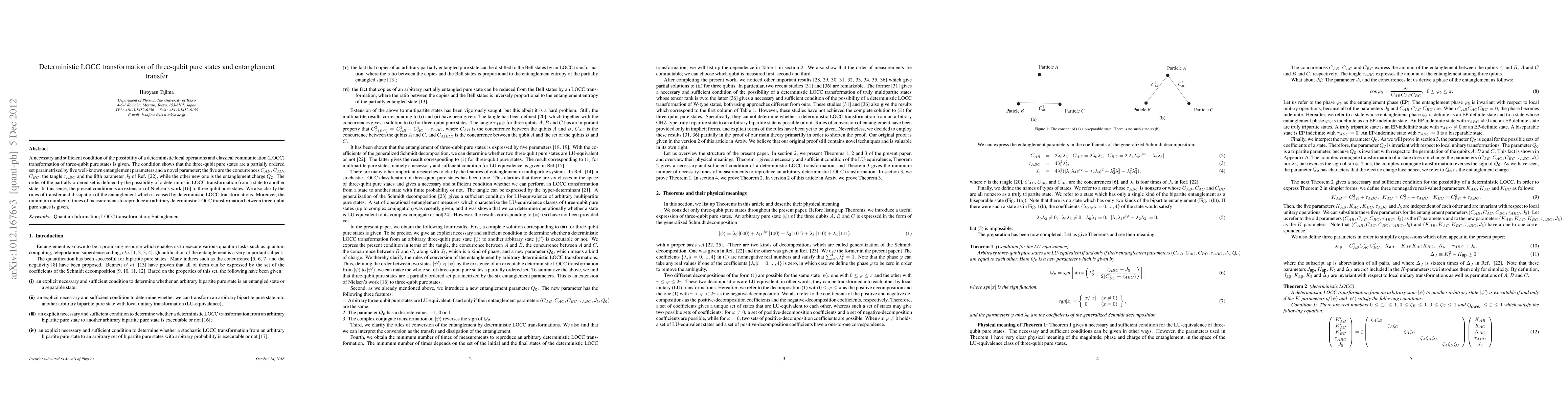 This paper provides a necessary and sufficient condition for deterministic local operations and classical communication (LOCC) transformations of three-qubit pure states, introducing a novel parameter alongside five well-known entanglement measures. It also outlines the rules for entanglement transfer and dissipation during such transformations.