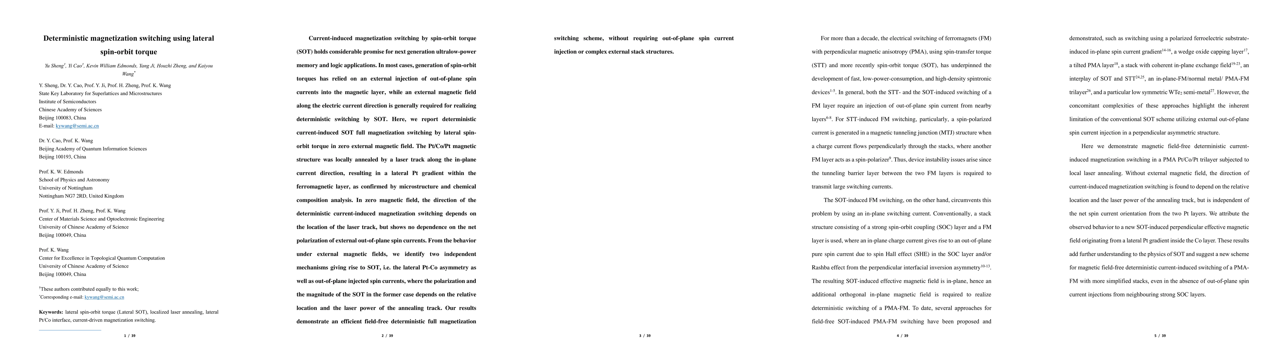 The paper introduces a novel method for deterministic magnetization switching using lateral spin-orbit torque, achieved through localized laser annealing to create a lateral Pt gradient in a Pt/Co/Pt structure.